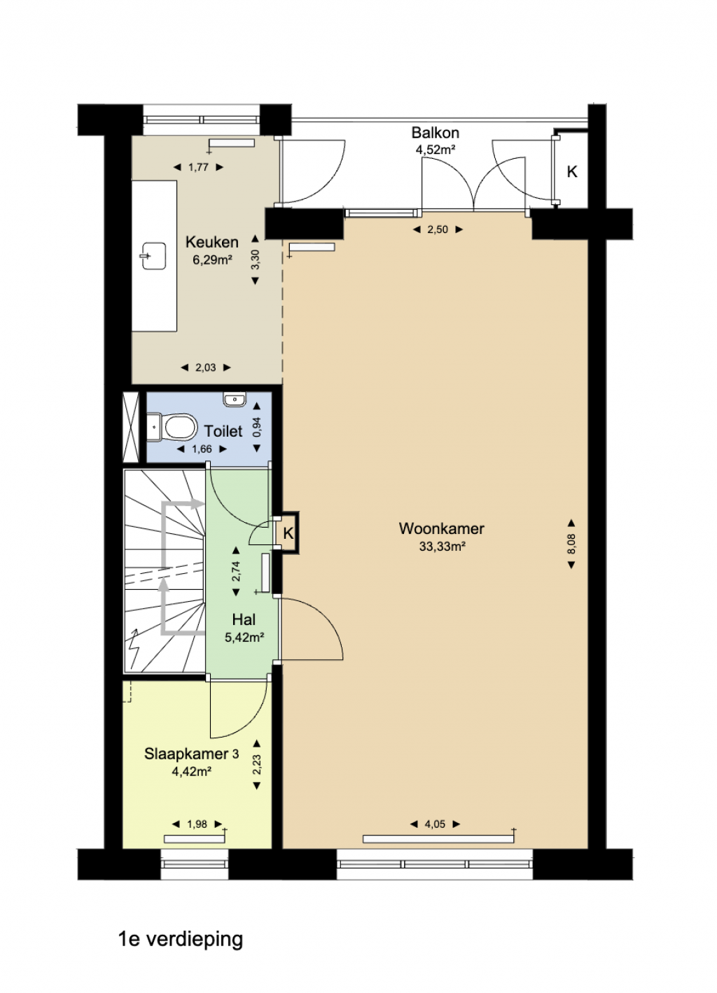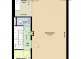Eerste verdieping: ruime woonkamer met aan de achterzijde het balkon en de dichte keuken voorzien van een standaard keukenblok en een een separaat toilet met een fonteintje, slaapkamer, interne trap naar de 2e verdieping.