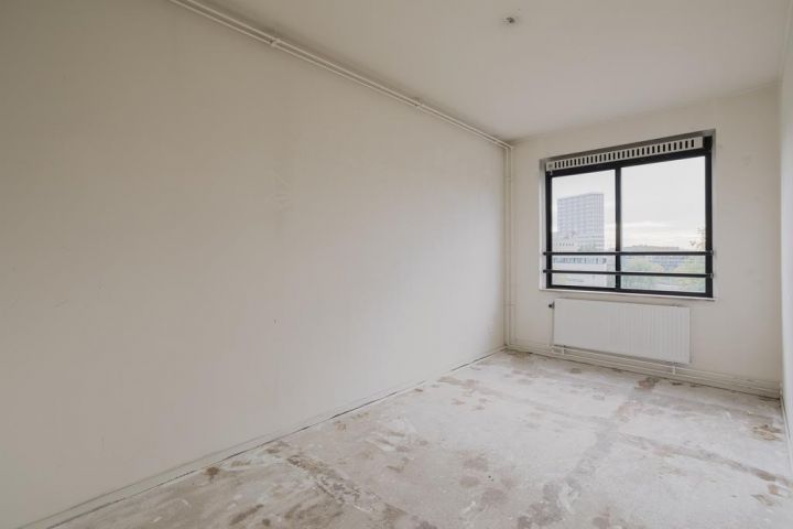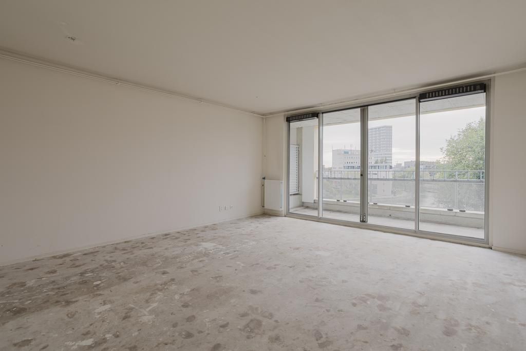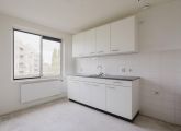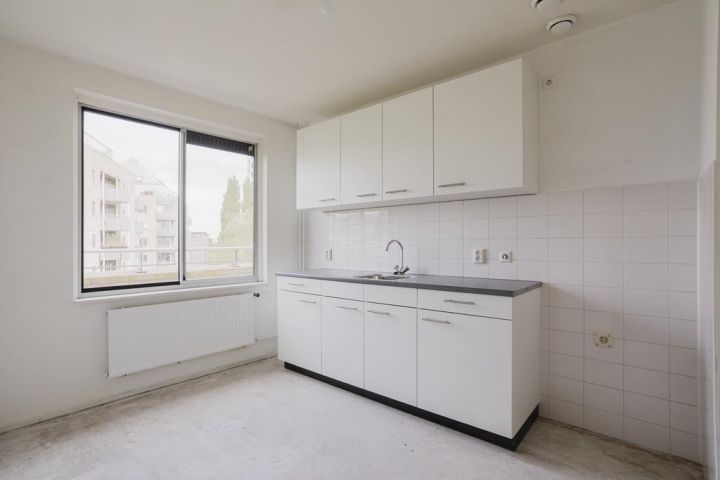Met de lift naar de vierde verdieping; entree, de dichte keuken voorzien van een standaard keukenblok aan de voorzijde, aan de achterzijde de woonkamer met toegang tot het balkon, separaat toilet met een fonteintje, interne trap naar de vijfde verdieping.