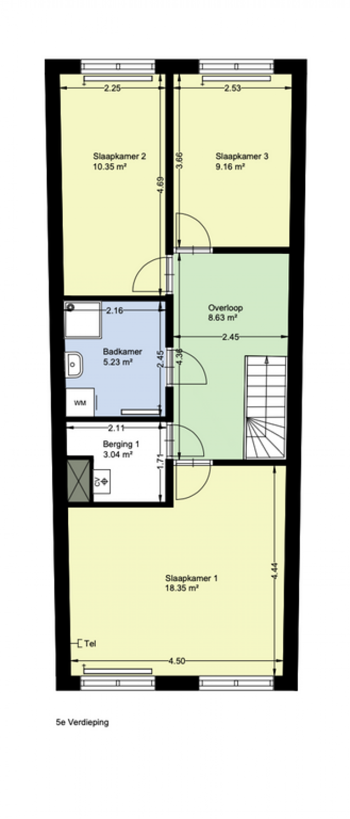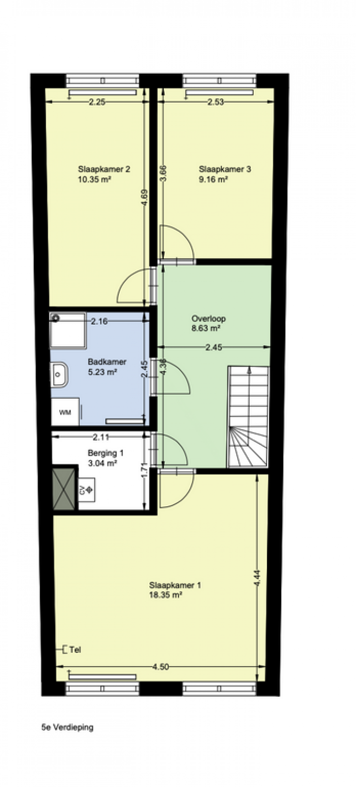 Vijfde verdieping; overloop, twee slaapkamers aan de voorzijde, de badkamer voorzien van een douche en wastafel, een slaapkamer aan de achterzijde.