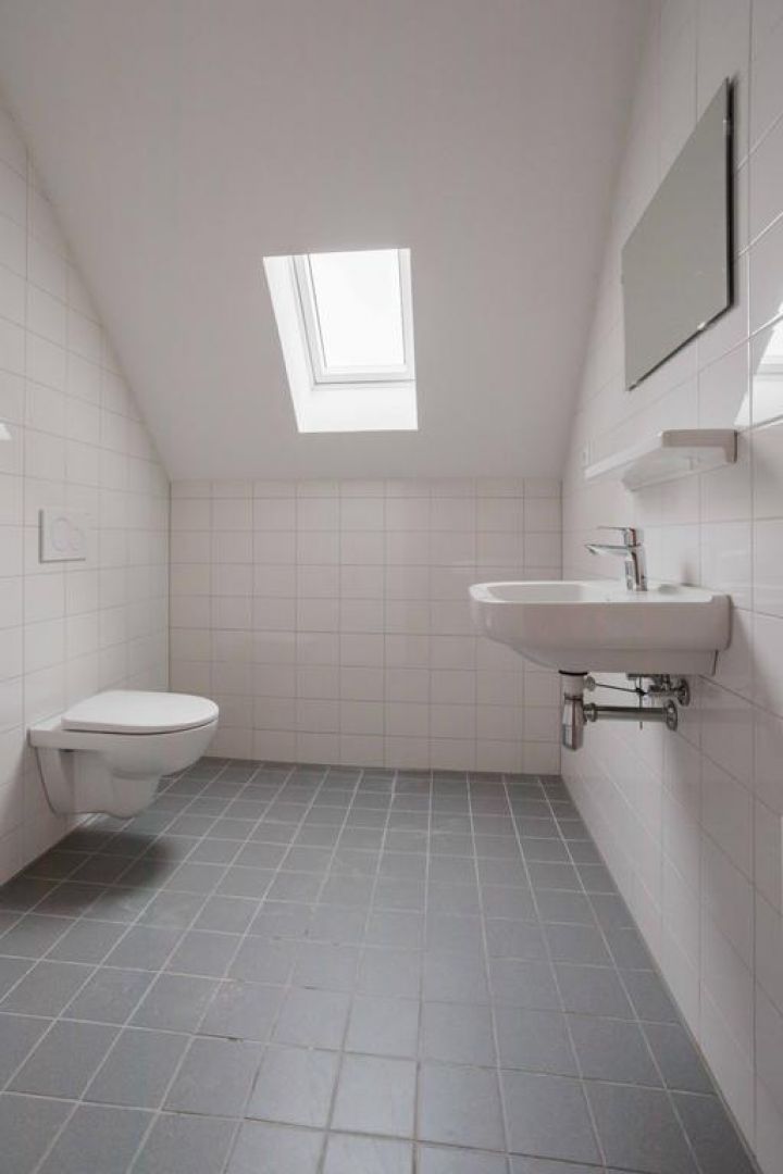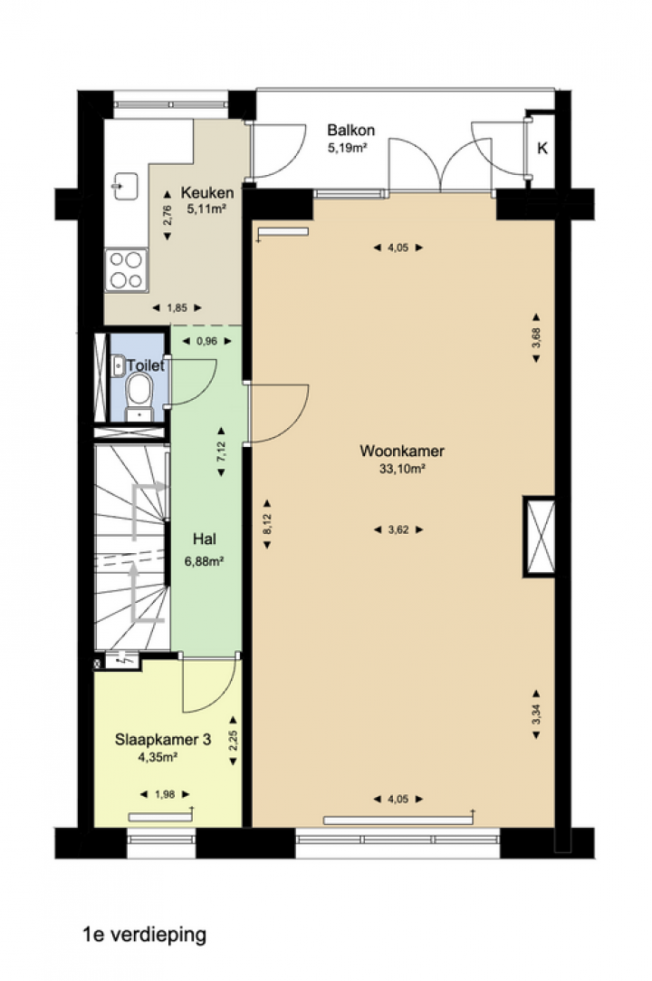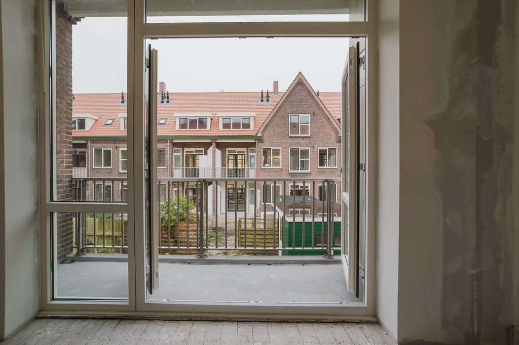 Eerste verdieping: overloop, grote doorzonwoonkamer met aan de achterzijde het balkon en een dichte keuken voorzien van een standaard keukenblok, separaat toilet met een fonteintje, kleine slaapkamer aan de voorzijde, interne trap naar de 2e verdieping.