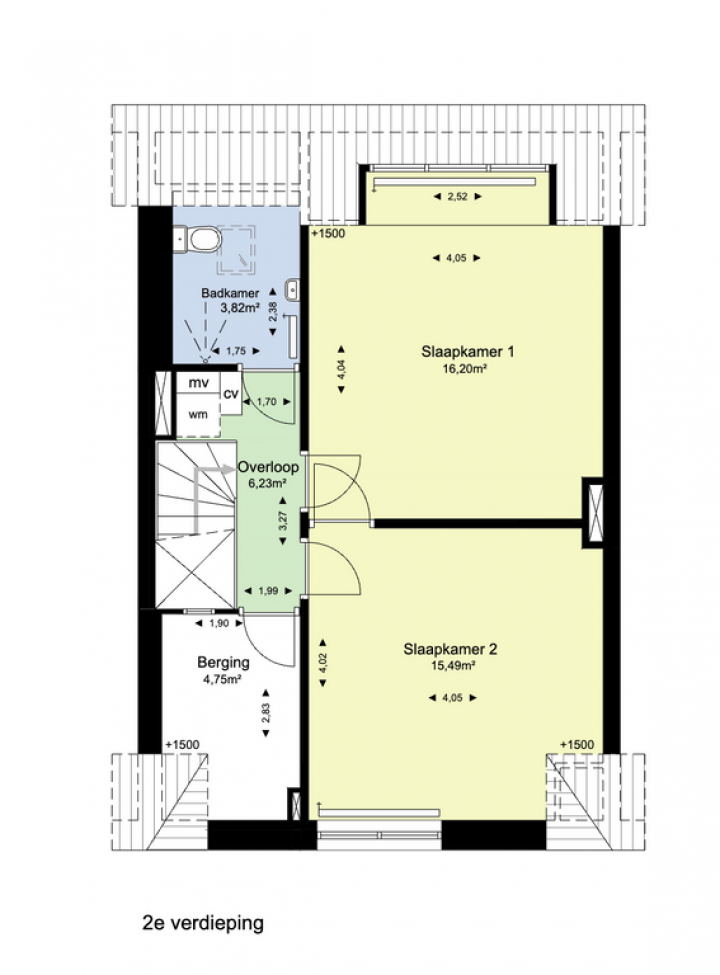Tweede verdieping: overloop, twee slaapkamers, badkamer voorzien van een douche en een wastafel en een inpandige berging / C.V. ruimte.