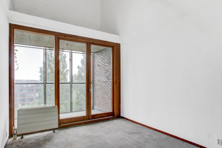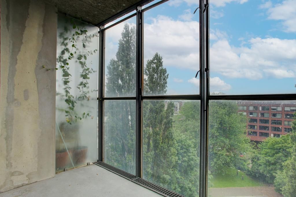 Zevende verdieping: de woonkamer met een open keuken, een slaapkamer aan de voorzijde met toegang tot het inpandig balkon, een separaat toilet met een fonteintje, de badkamer voorzien van een douche en een wastafel, een slaapkamer aan de achterzijde.