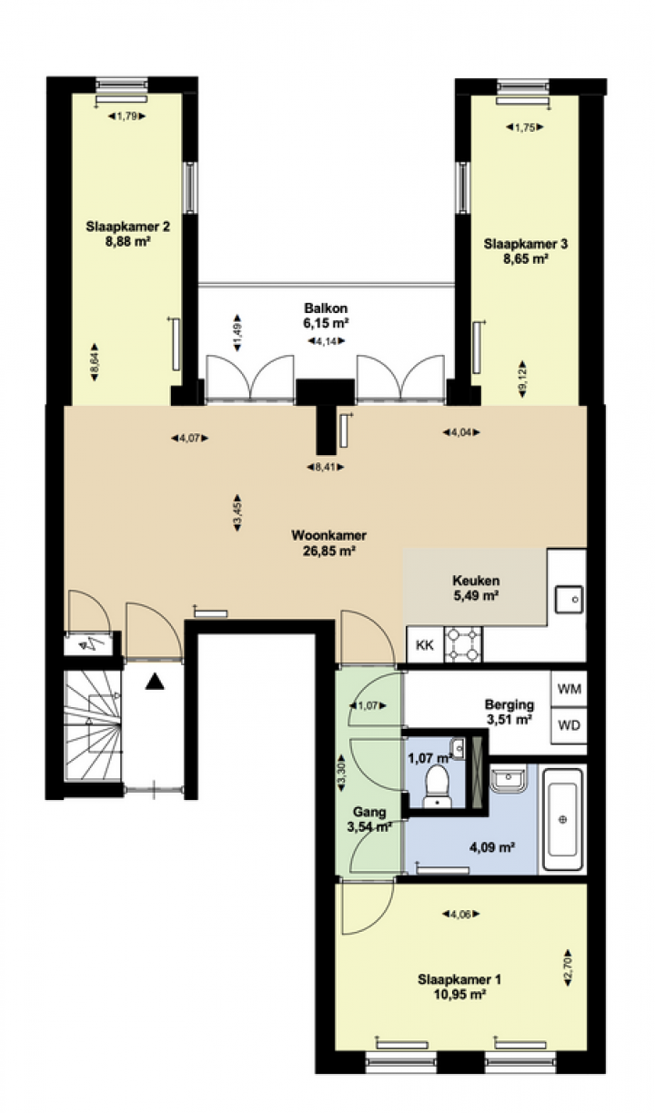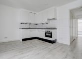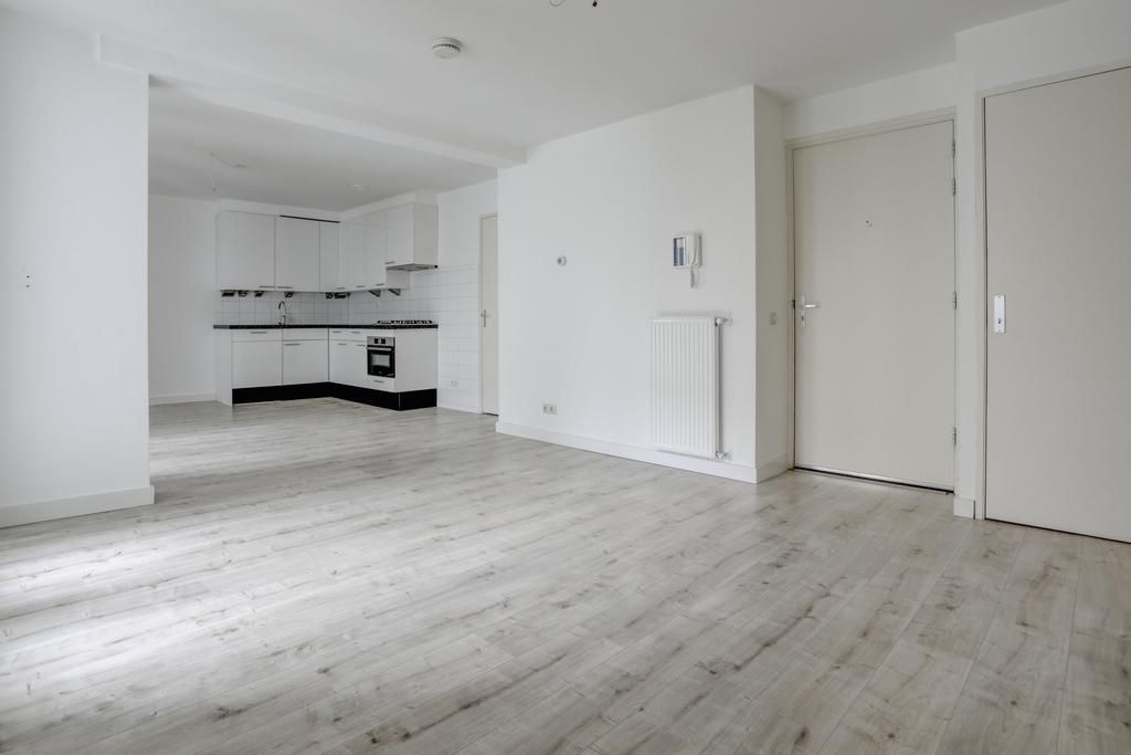 Entree op de tweede verdieping, ruime woonkeuken voorzien van diverse inbouwapparatuur en toegang tot het balkon, een slaapkamer gelegen aan de achterzijde, separaat toilet met een fonteintje, de badkamer is voorzien van een wastafel en een bad/douche combinatie, de tweede slaapkamer is gelegen aan de voorzijde.