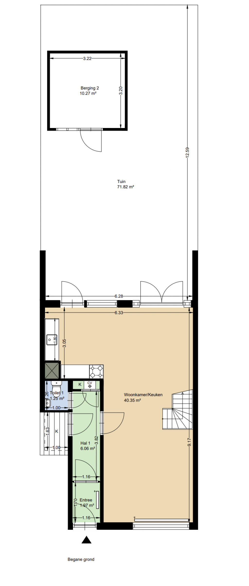 Entree op begane grond; de woonkamer aan de voorzijde, open keuken voorzien van een standaard keukenblok aan de achterzijde met toegang tot de tuin, een separaat toilet met een fonteintje, interne trap naar de eerste verdieping.