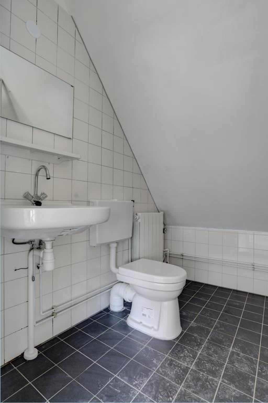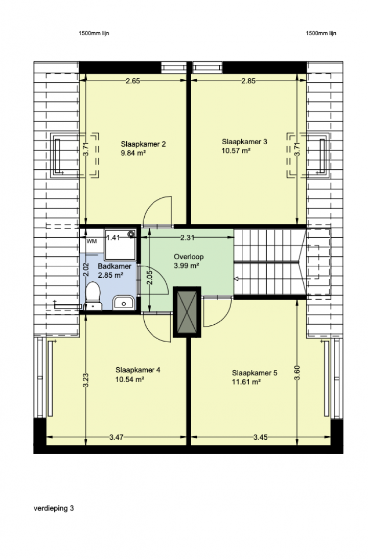 Vierde verdieping: overloop, twee slaapkamers aan de voorzijde, twee slaapkamers aan de achterzijde en de badkamer voorzien van een douche, wastafel en (tweede) toilet.