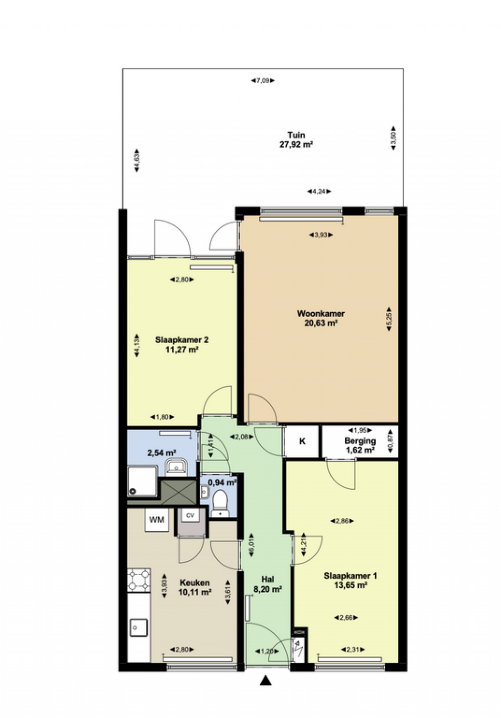 Entree op de begane grond, hal, aan de voorzijde de dichte keuken voorzien van een standaard keukenblok en een slaapkamer, een separaat toilet met een fonteintje, de badkamer beschikt over een douche en een wastafel, de woonkamer en een slaapkamer aan de achterzijde met toegang tot de tuin.
