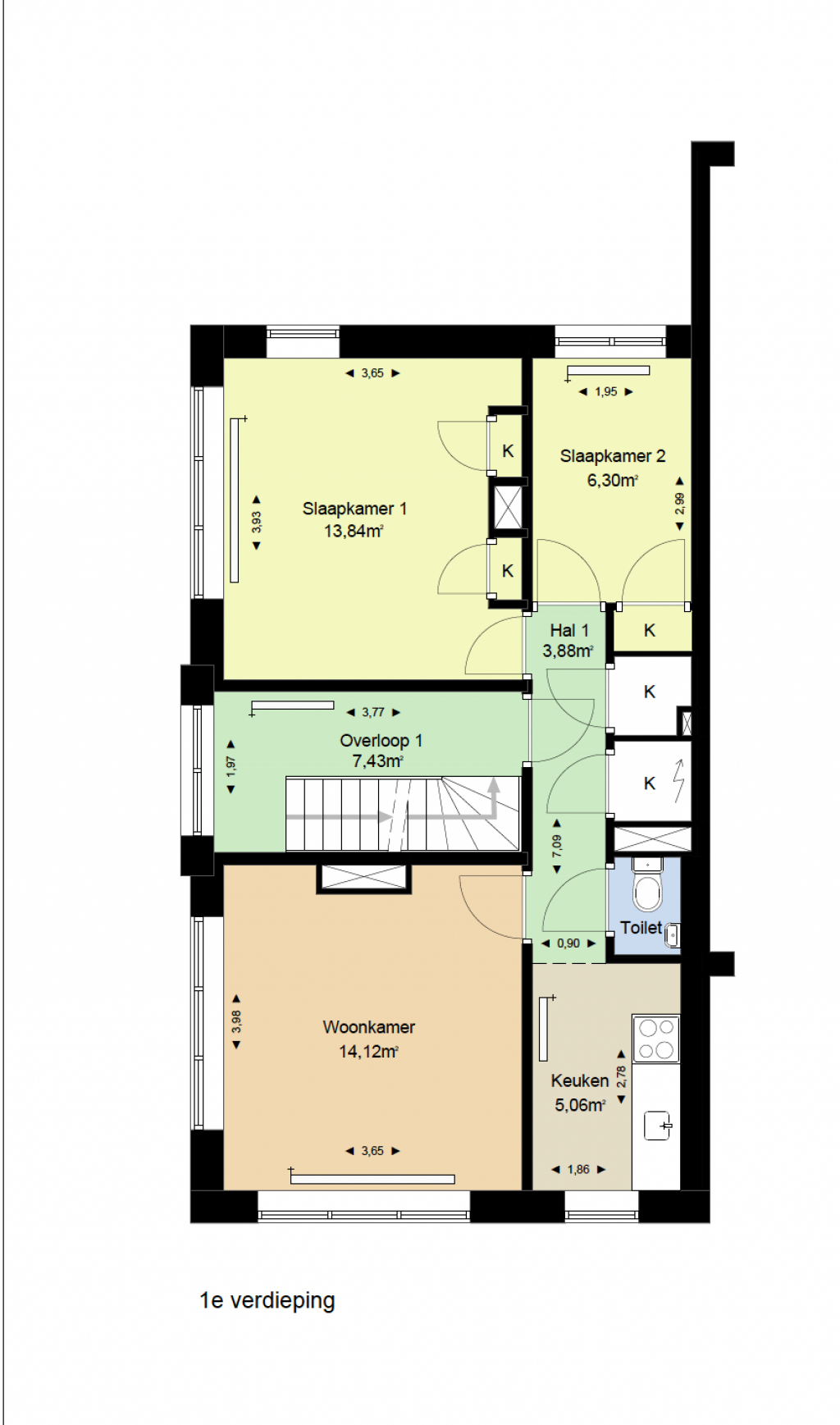 Entree op de begane grond, met de trap naar de eerste verdieping; woonkamer en de dichte keuken voorzien van een standaard keukenblok, een separaat toilet met een fonteintje en twee slaapkamers aan de achterzijde, via de interne trap naar de tweede verdieping.