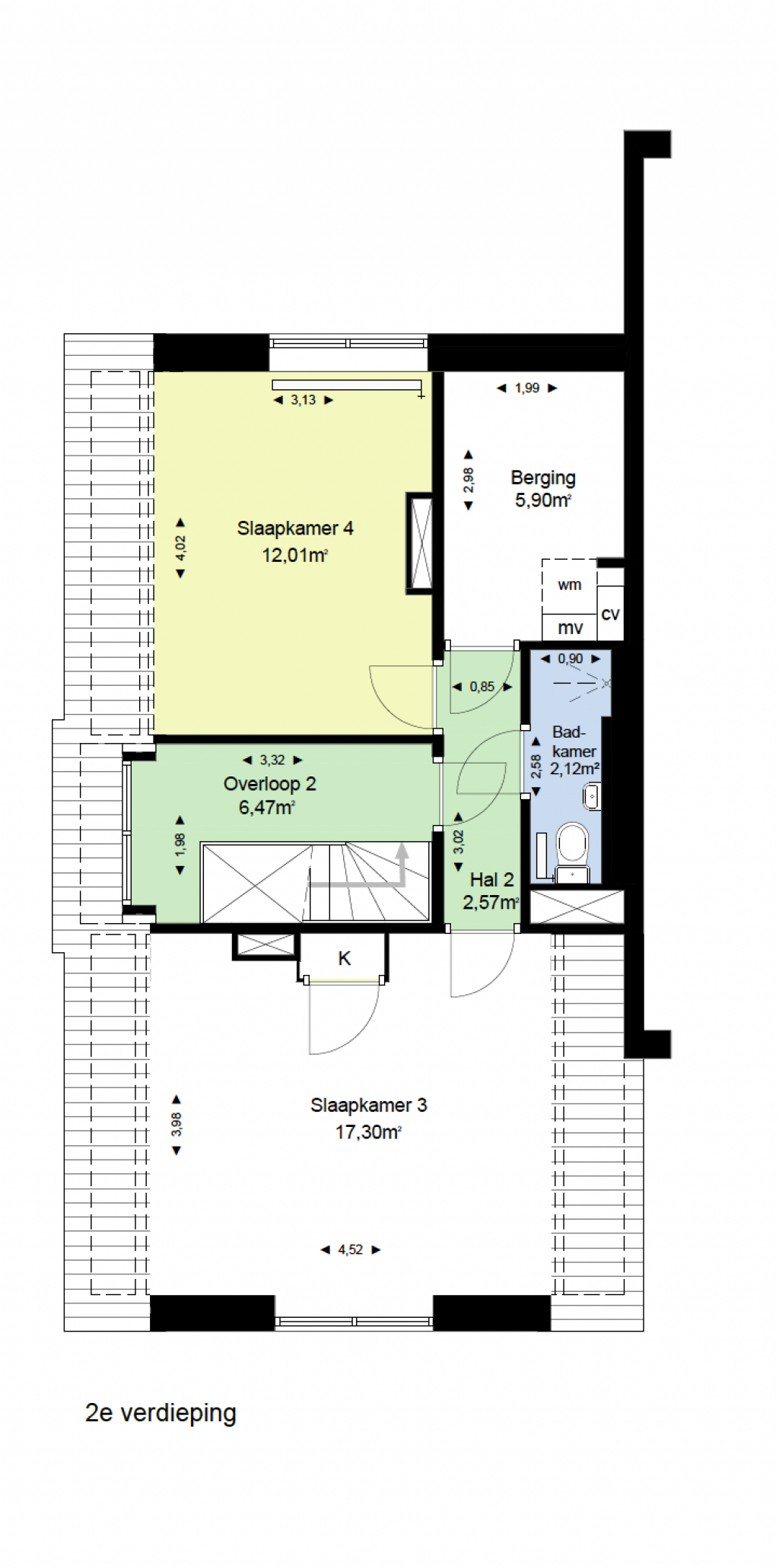 Tweede verdieping: Overloop, een slaapkamer aan de voorzijde, de badkamer is voorzien van een douche, een wastafel en een tweede toilet, een slaapkamer en de inpandige berging aan de achterzijde.