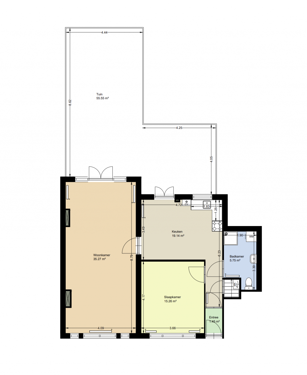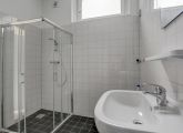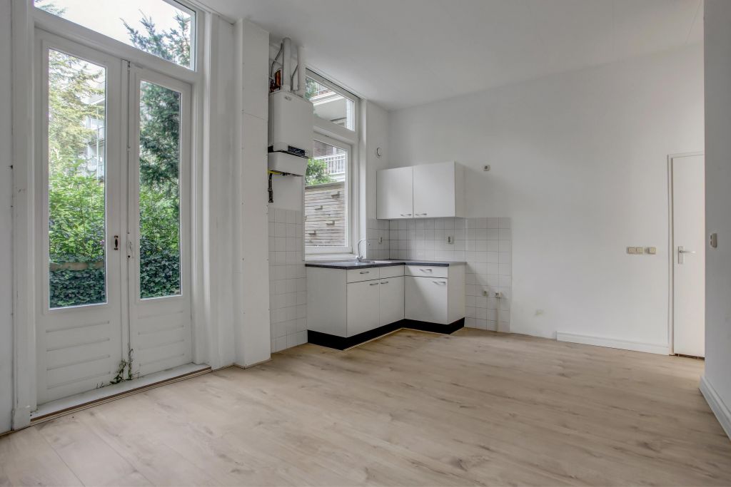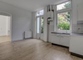 Een royaal 2-kamer appartement gelegen op de begane grond. Entree, slaapkamer gelegen aan de voorzijde, ruime keuken met toegang tot de tuin, badkamer met douche en toilet, trap naar het souterrain.