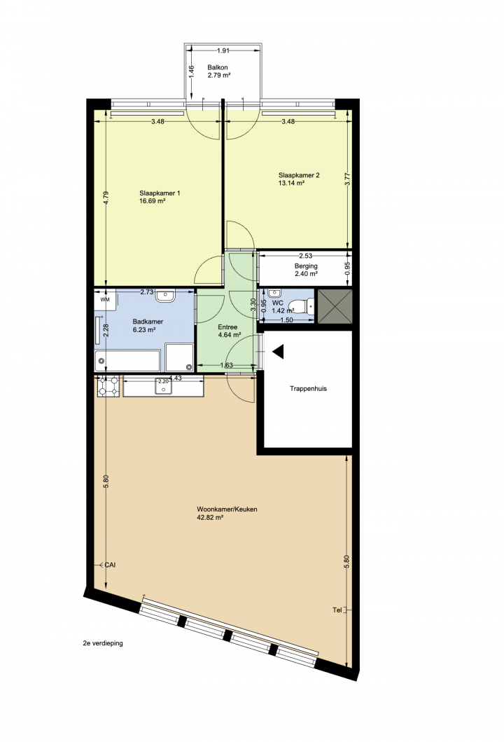 Entree op de tweede verdieping; hal, separaat toilet met een fonteintje, woonkamer gelegen aan de voorzijde met een open keuken met een standaard keukenblok, badkamer voorzien van een ligbad, separate douche en een wastafel, twee grote slaapkamers aan de achterzijde met een klein balkon op het zuidoosten.
