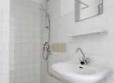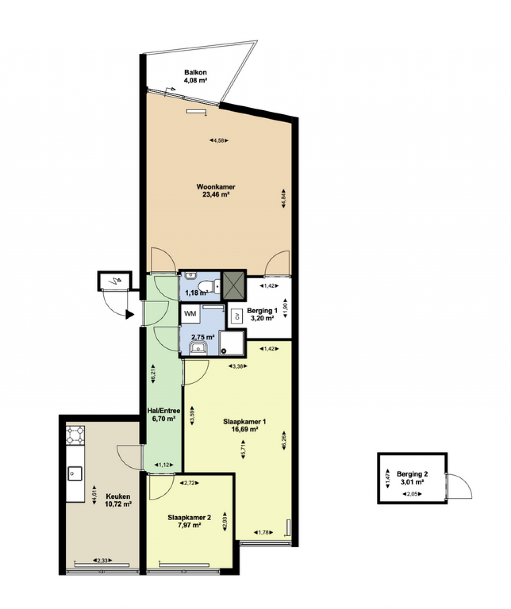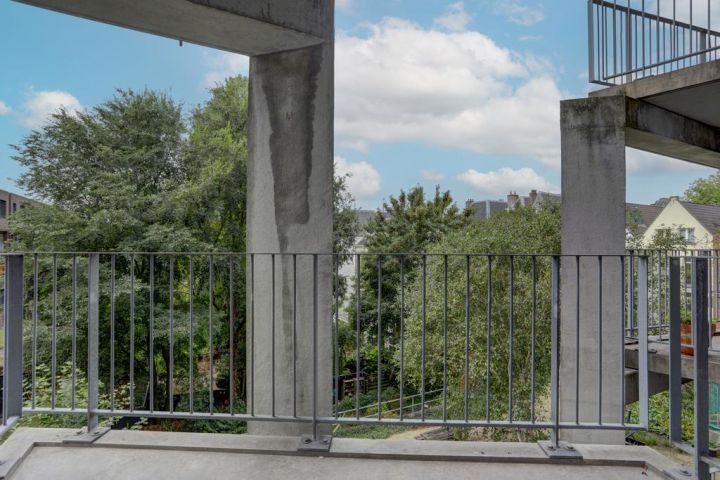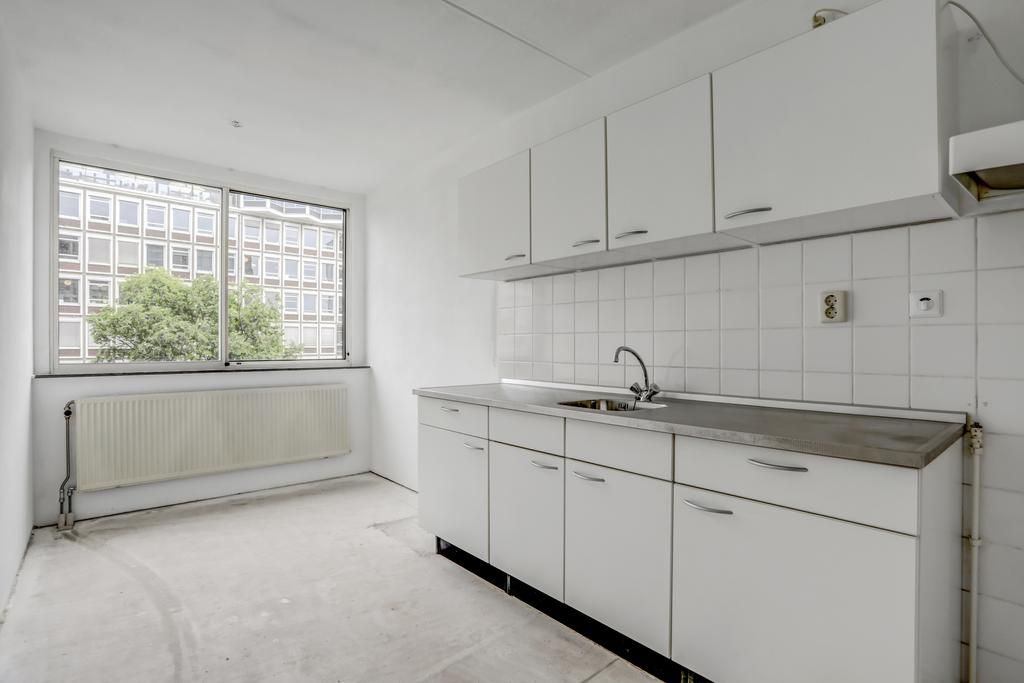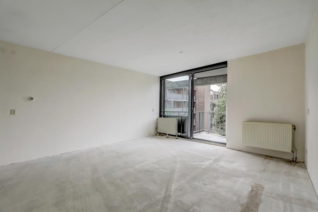 Entree op de derde verdieping, ruime woonkamer met toegang tot het balkon (westen) aan de achterzijde, de badkamer is voorzien van een wastafel en douche, een separaat toilet met een fonteintje, twee slaapkamers en de dichte keuken voorzien van een standaard keukenblok aan de voorzijde.