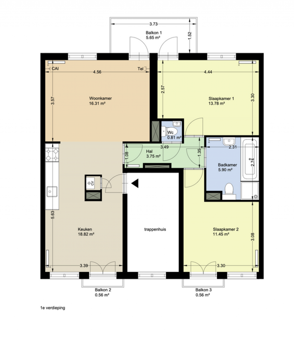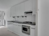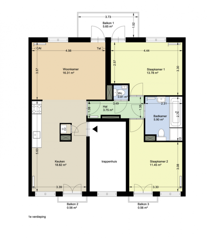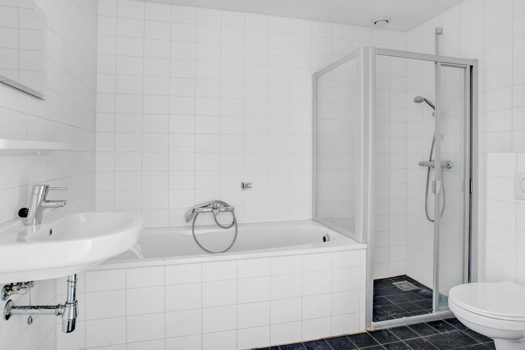 Via het gemeenschappelijk trappenhuis naar de eerste verdieping; entree, aan de voorzijde de woonkeuken voorzien van een luxe keukenblok met inbouwapparatuur, de woonkamer aan de achterzijde met toegang tot het balkon gelegen op het oosten, een separaat toilet met een fonteintje, de badkamer is voorzien van een bad/douche combinatie, wastafel en (tweede) toilet, een slaapkamer aan de achterzijde met tevens toegang het balkon en een slaapkamer aan de voorzijde.