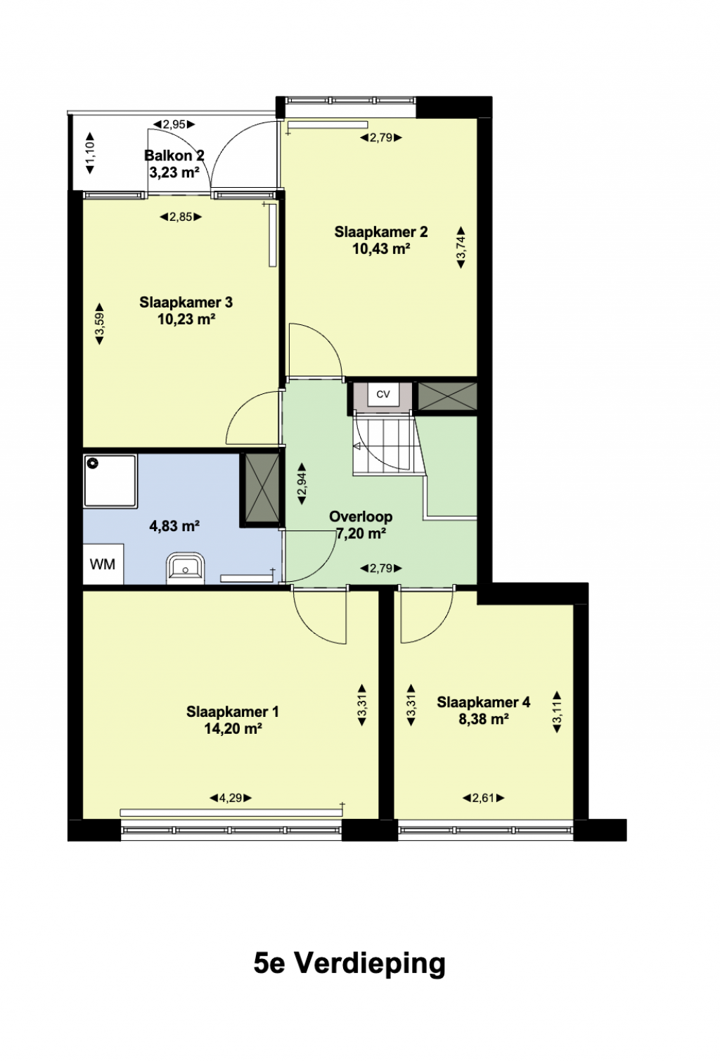 Vijfde verdieping: overloop, twee slaapkamers aan de voorzijde, de badkamer is voorzien van een douche en een wastafel, twee slaapkamers aan de achterzijde met toegang tot het balkon.