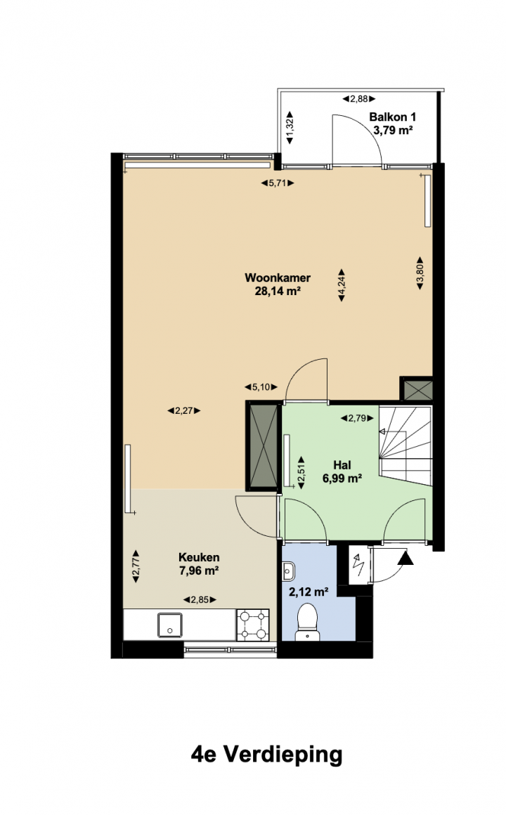 Via het gemeenschappelijk trappenhuis naar de vierde verdieping: entree, woonkamer met een open keuken en een balkon gelegen op het zuiden, interne trap naar de vijfde verdieping.