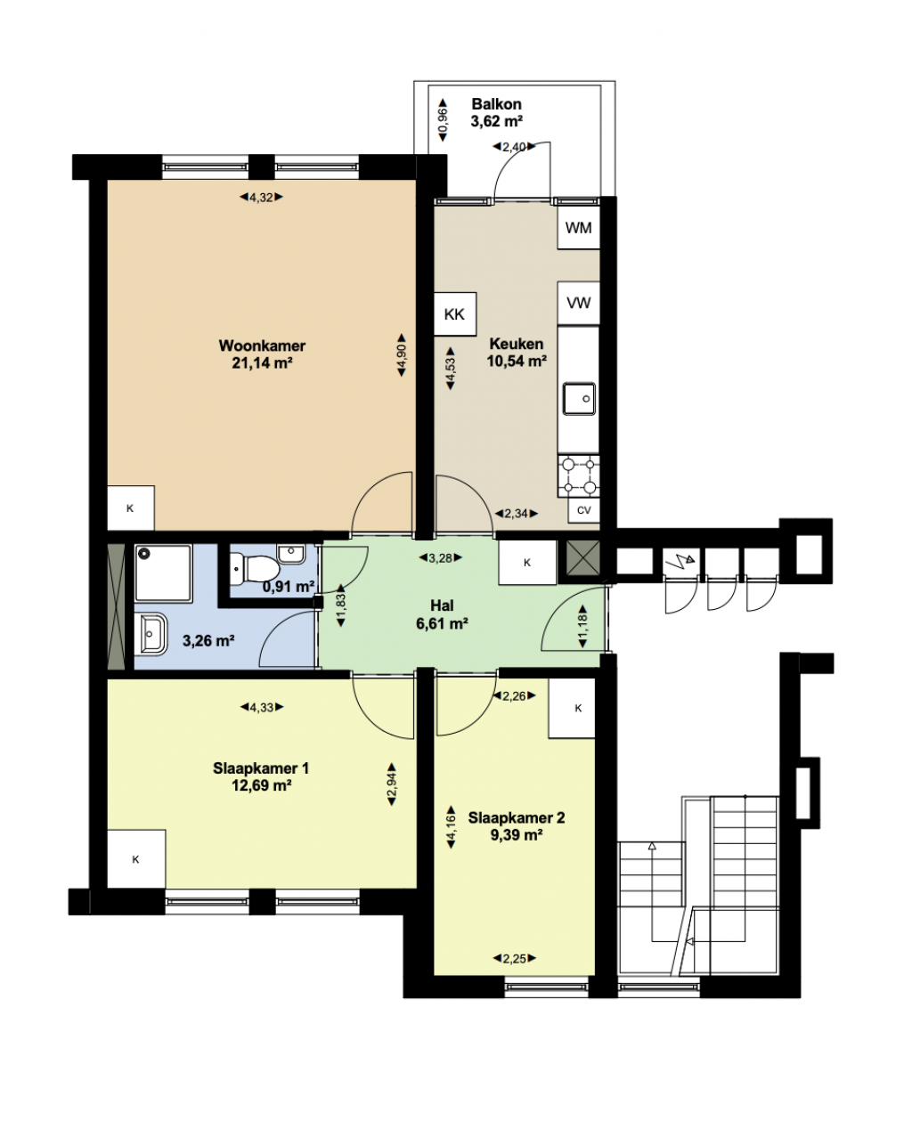 Entree op de eerste verdieping, hal, twee slaapkamers gelegen aan de voorzijde, de badkamer voorzien van een douche, wastafel, separate toilet, dichte keuken voorzien van een standaard keukenblok en met toegang tot een balkon, balkon gelegen op het zuiden en de woonkamer gelegen aan de achterzijde.