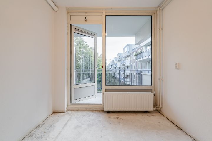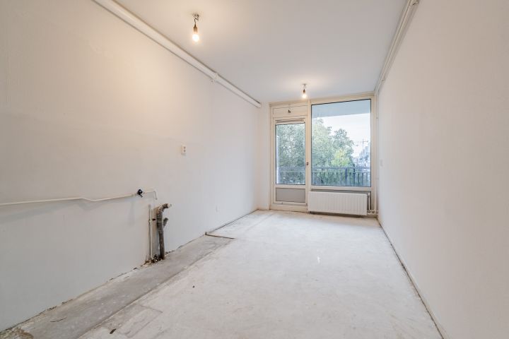 Entree woning, hal met meterkast, separaat toilet en toegang tot de overige vertrekken. De woonkamer is gelegen aan de voorzijde en heeft zeer veel lichtinval. Twee slaapkamers gelegen aan de achterzijde, alsmede de keuken die toegang geeft tot het balkon op het zuidoosten. De keuken is voorzien van alle aansluitingen, hier kun je de keuken van je dromen realiseren. In een separate kast bevindt zich de cv-ketel (Nefit uit PM).