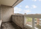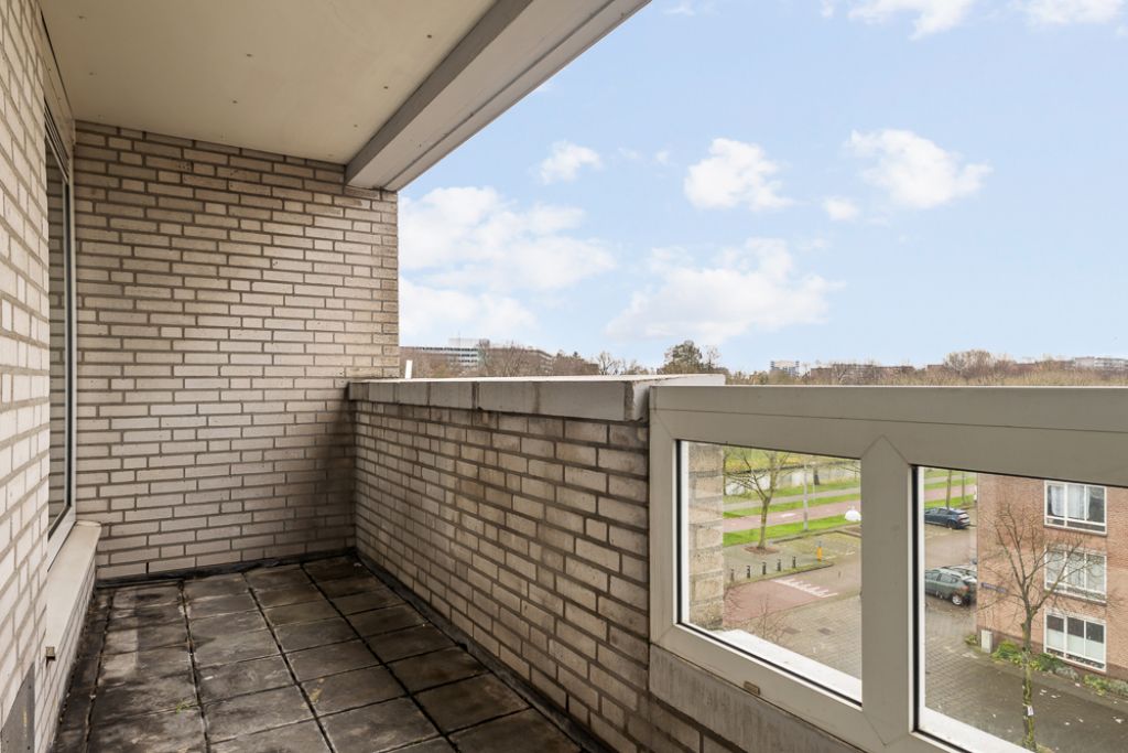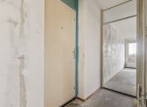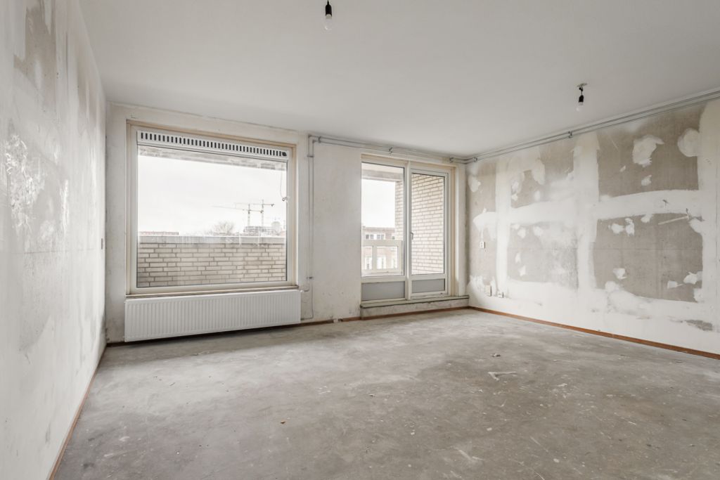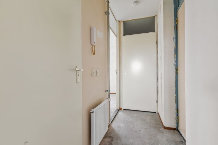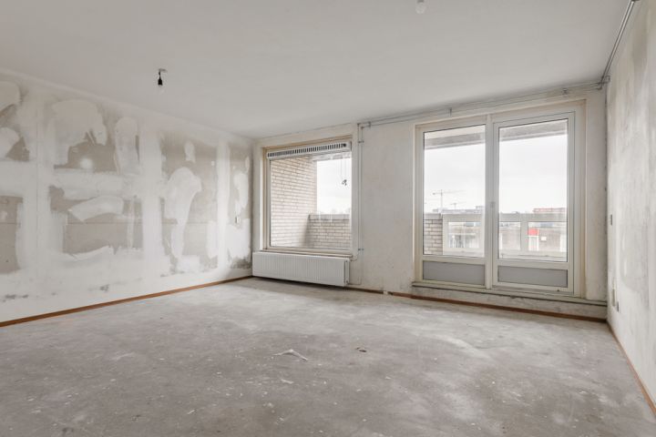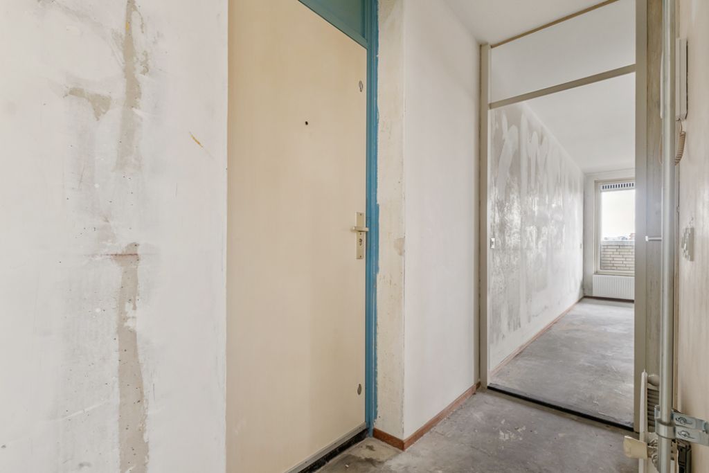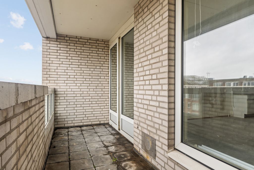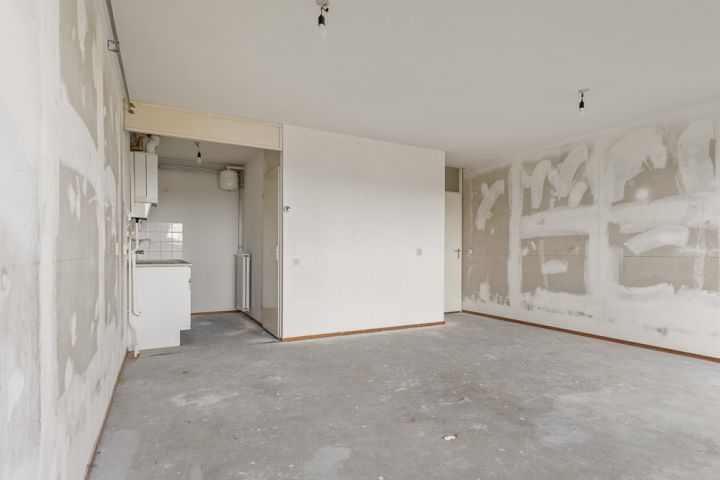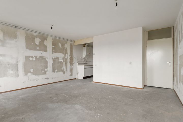 Het appartement bevindt zich op de vierde en tevens bovenste etage en is bereikbaar via het gemeenschappelijke trappenhuis. Je komt binnen in de hal, die toegang biedt tot alle vertrekken. Aan de linkerzijde vind je de woonkamer met een halfopen keuken, uitgerust met een eenvoudig keukenblok dat geheel naar eigen smaak kan worden afgewerkt. De woonkamer ligt aan de voorzijde van het appartement, vanuit hier heb je toegang tot een breed balkon op het zuidoosten en omdat je op de bovenste etage zit geniet je hier van een wijds uitzicht.