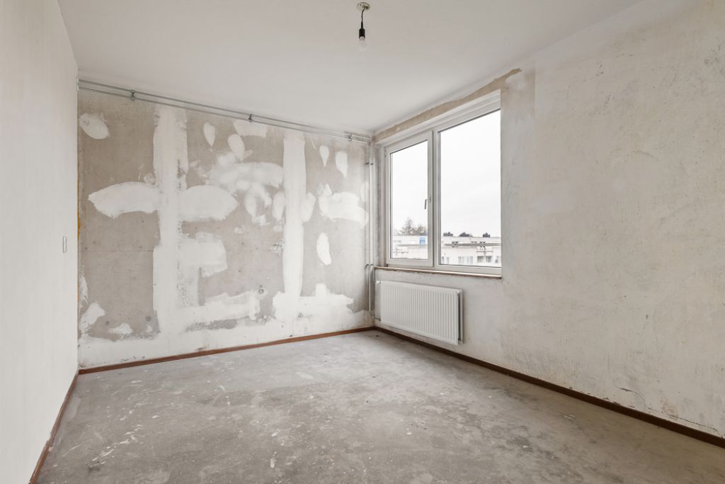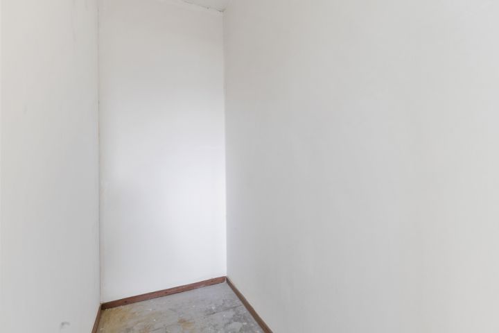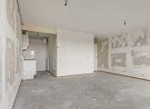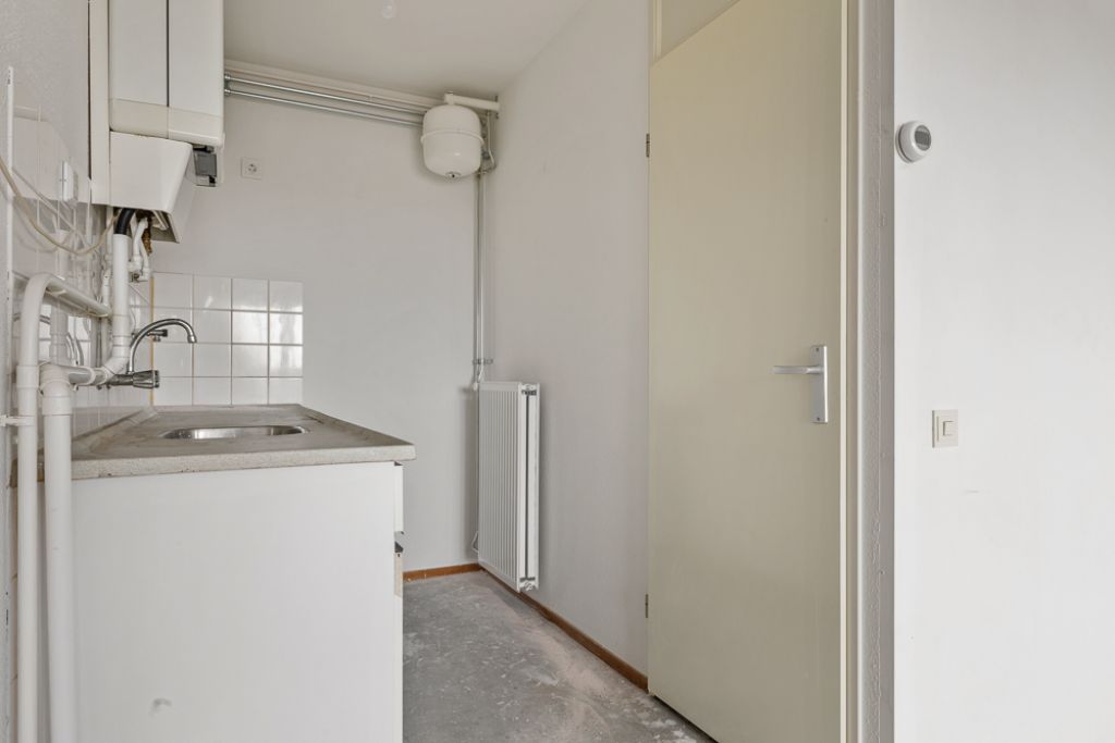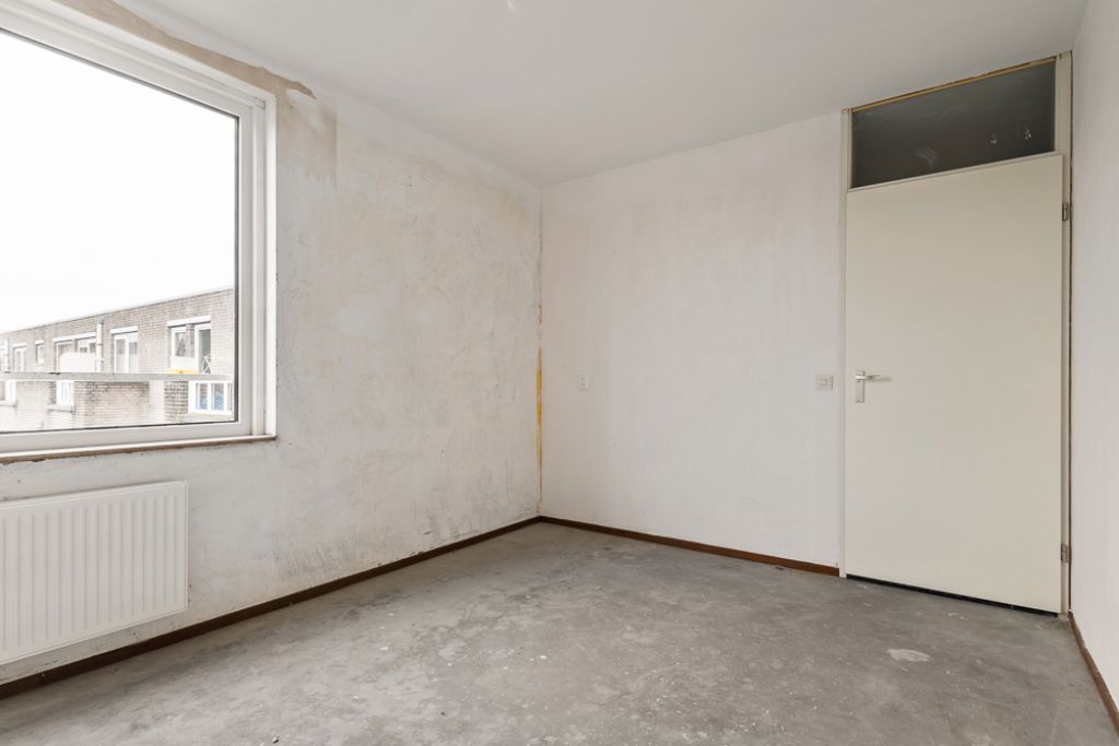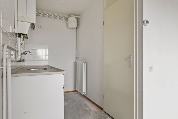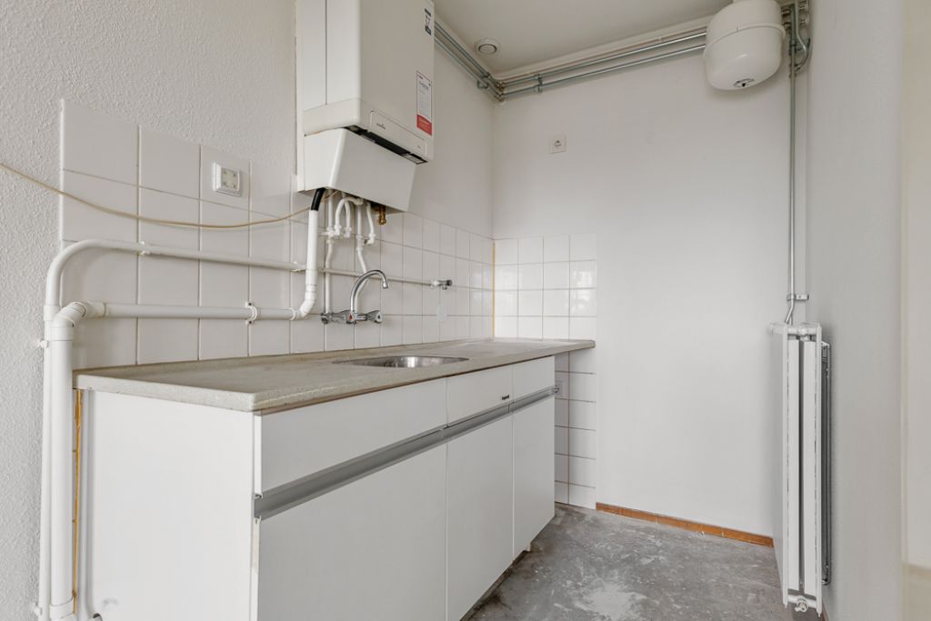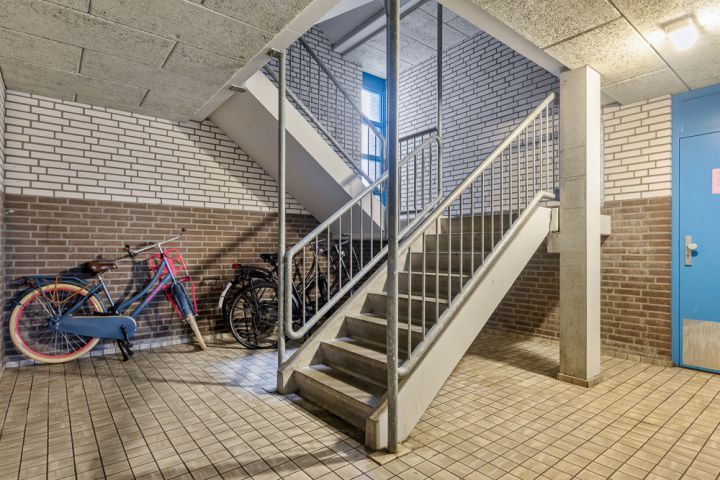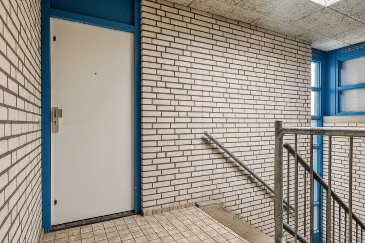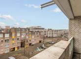 Het appartement bevindt zich op de vierde en tevens bovenste etage en is bereikbaar via het gemeenschappelijke trappenhuis. Je komt binnen in de hal, die toegang biedt tot alle vertrekken. Aan de linkerzijde vind je de woonkamer met een halfopen keuken, uitgerust met een eenvoudig keukenblok dat geheel naar eigen smaak kan worden afgewerkt. De woonkamer ligt aan de voorzijde van het appartement, vanuit hier heb je toegang tot een breed balkon op het zuidoosten en omdat je op de bovenste etage zit geniet je hier van een wijds uitzicht.