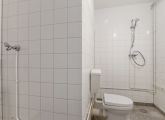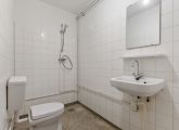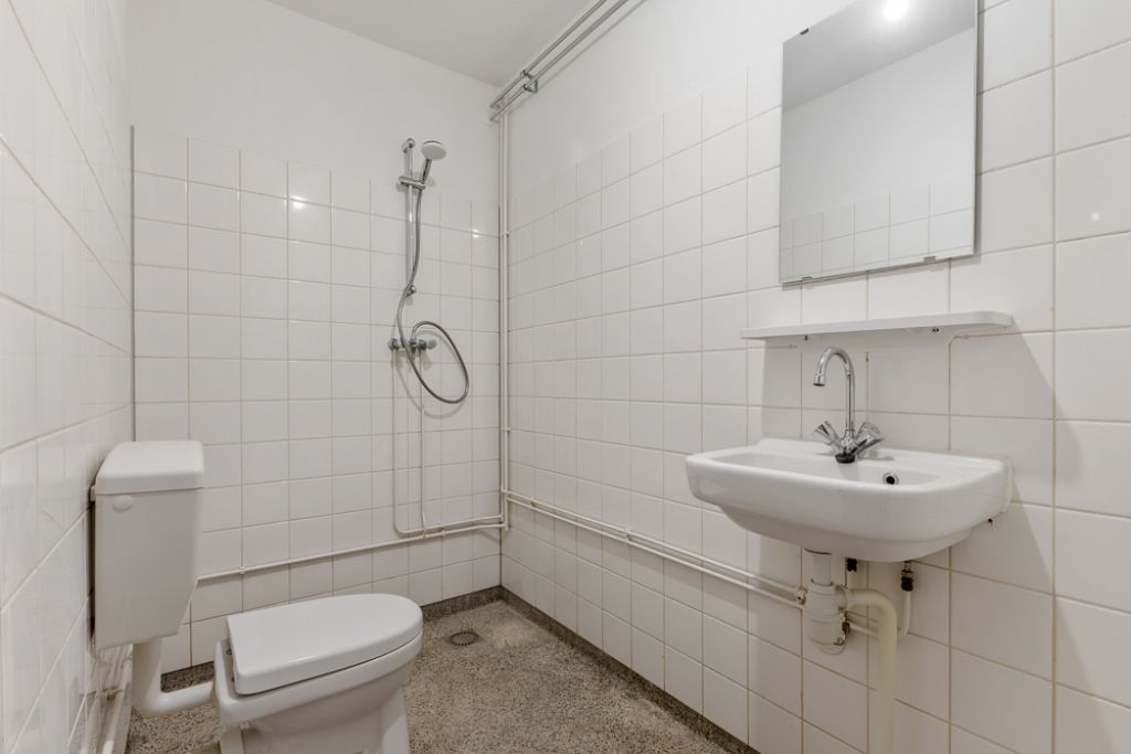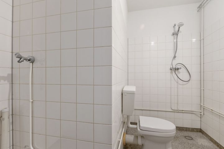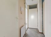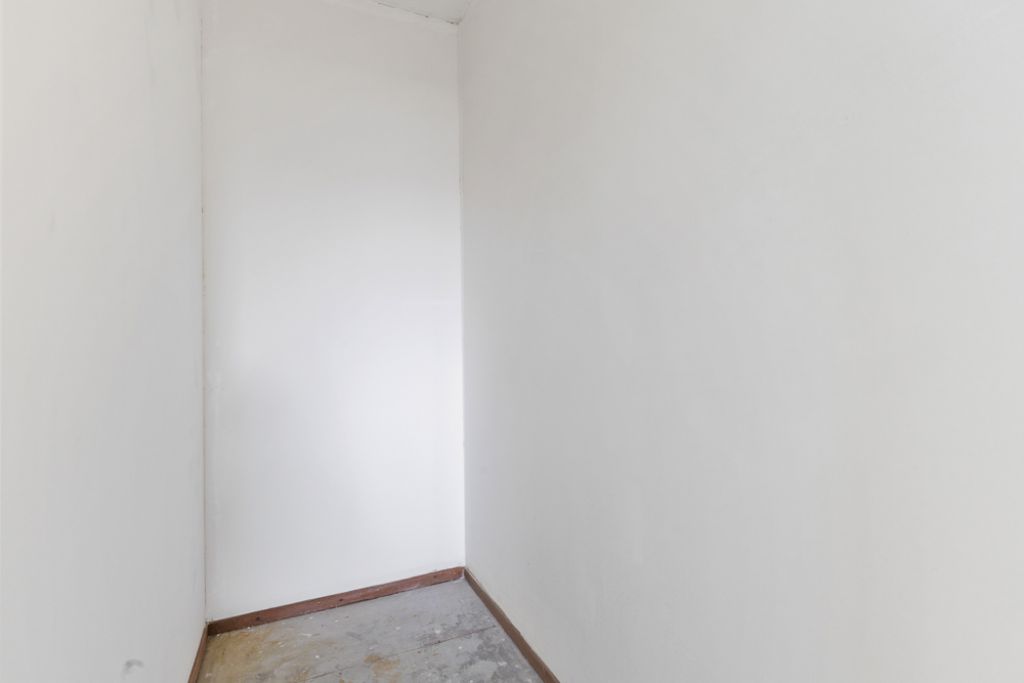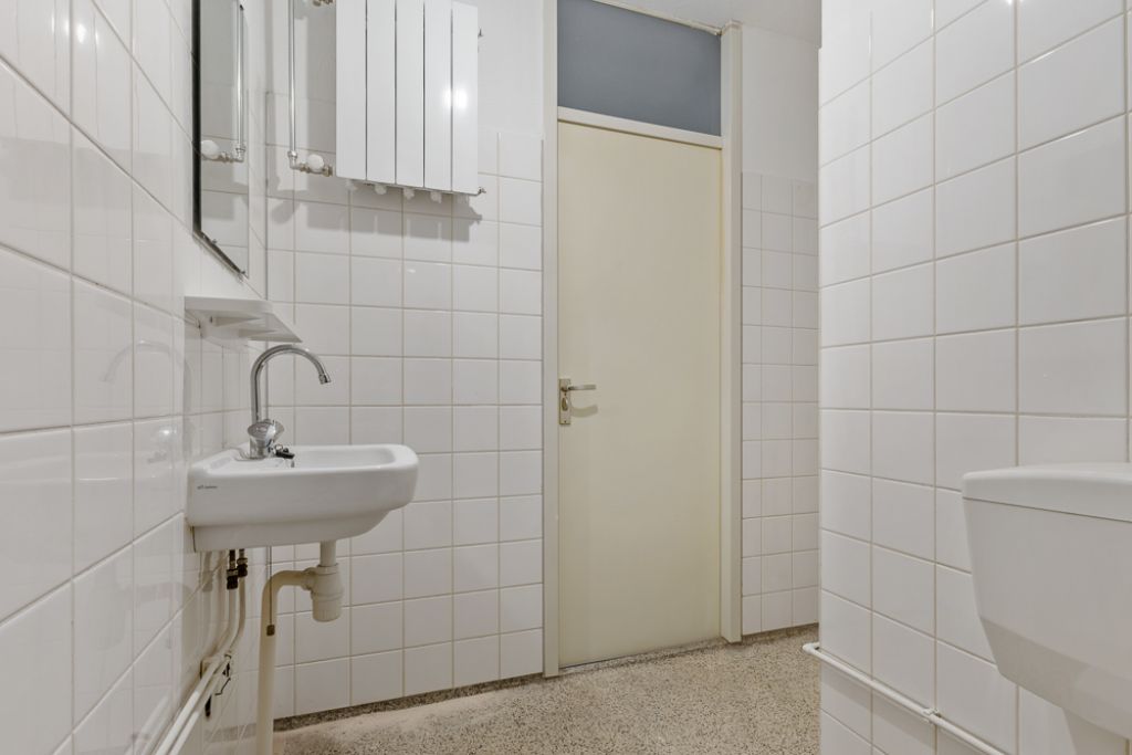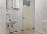 Aan de rechterzijde van de hal bevinden zich een bergkast en een ruime slaapkamer met uitzicht op de groene binnentuin. Centraal in de woning ligt de badkamer, voorzien van een wastafel, wasmachineaansluiting, douche en toilet. Daarnaast beschikt het appartement over een kleine separate berging.