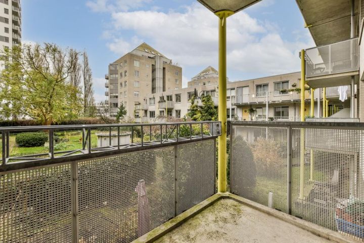 Upon entering on the second floor of a well-maintained complex. The spacious hall gives access to all rooms such as a storage room and a separate toilet. Large windows and sliding doors to the balcony make the living room beautifully light. This balcony has an area of 4 m2, faces south and has a view over the shared courtyard. The closed kitchen and both bedrooms are located at the front of the house. Do you prefer a completely open kitchen? Which can! This wall has no load-bearing function. The bathroom is centrally located in the apartment with a granite floor and washing machine connection.