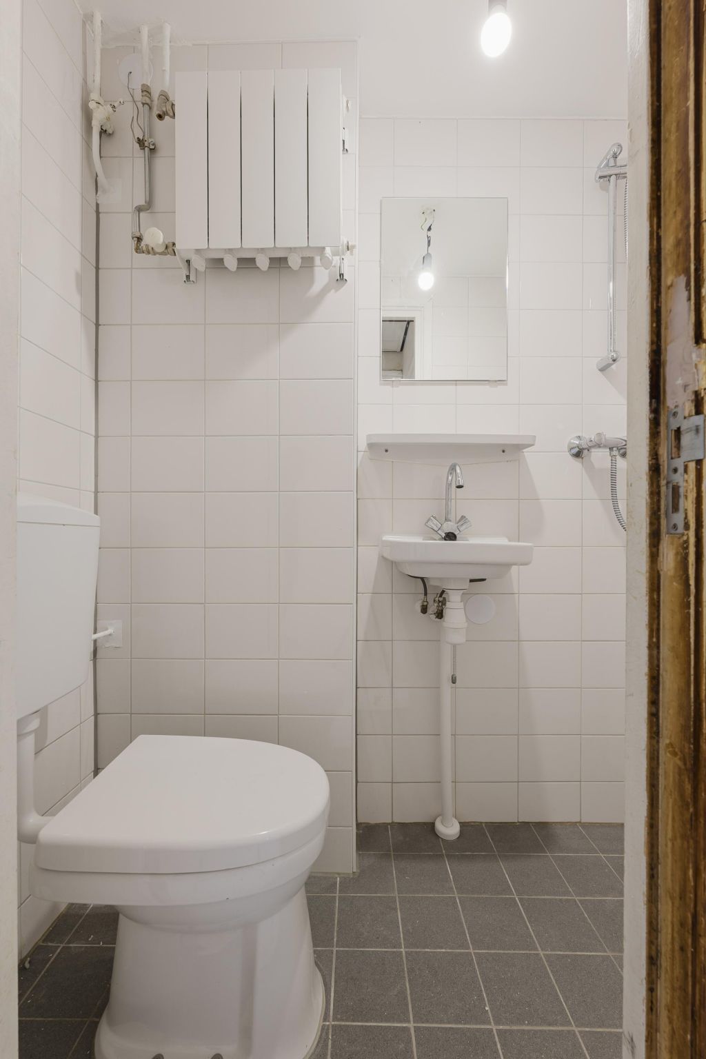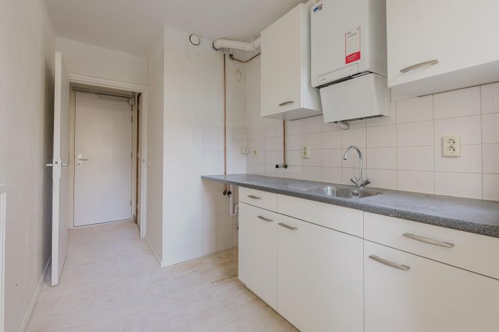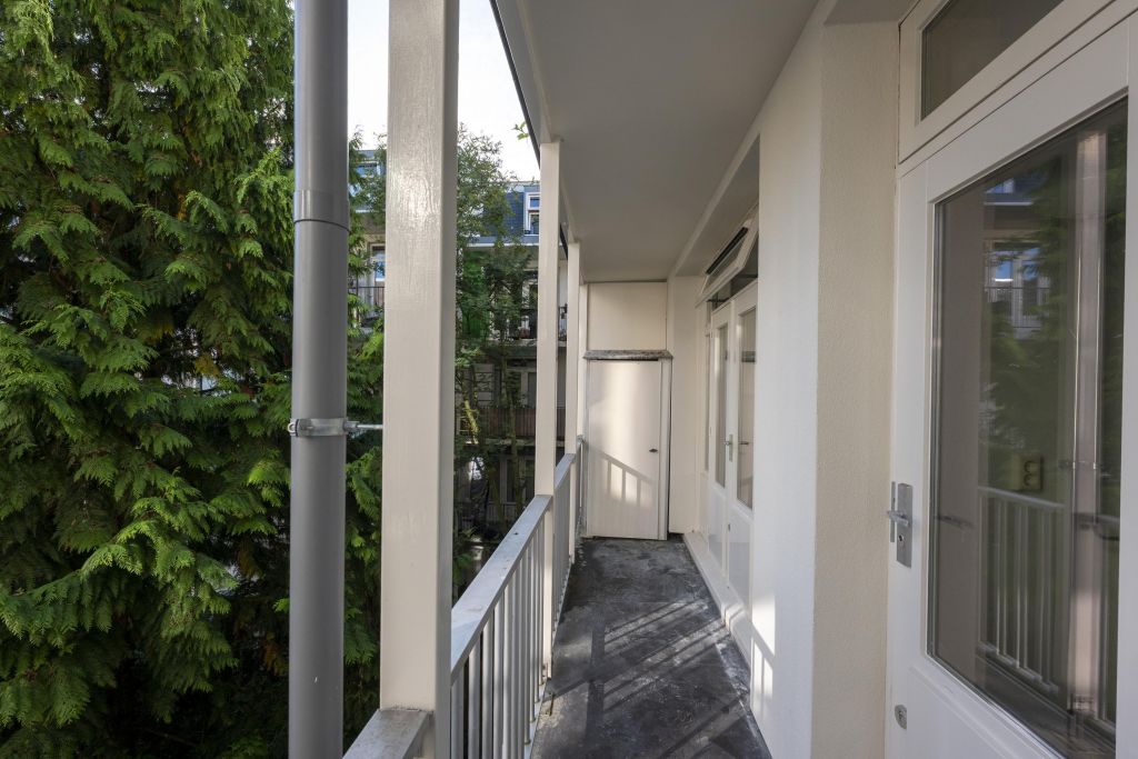 Via het gemeenschappelijk trappenhuis naar de tweede verdieping; entree, aan de voorzijde de ruime woonkamer, een slaapkamer, aan de achterzijde de dichte keuken voorzien van een standaard keukenblok, de badkamer voorzien van een toilet, een douche en een wastafel en de tweede slaapkamer met toegang tot het balkon.