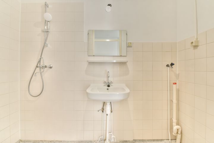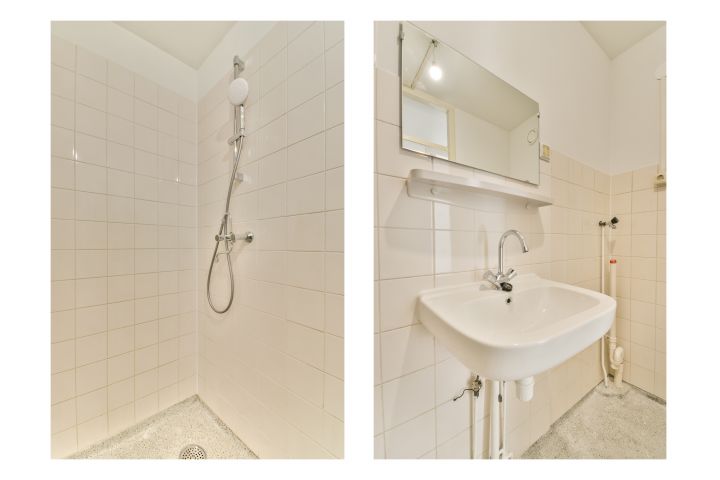 - Badkamer met wastafel, douche en wasmachine aansluiting;