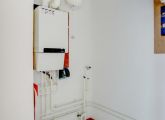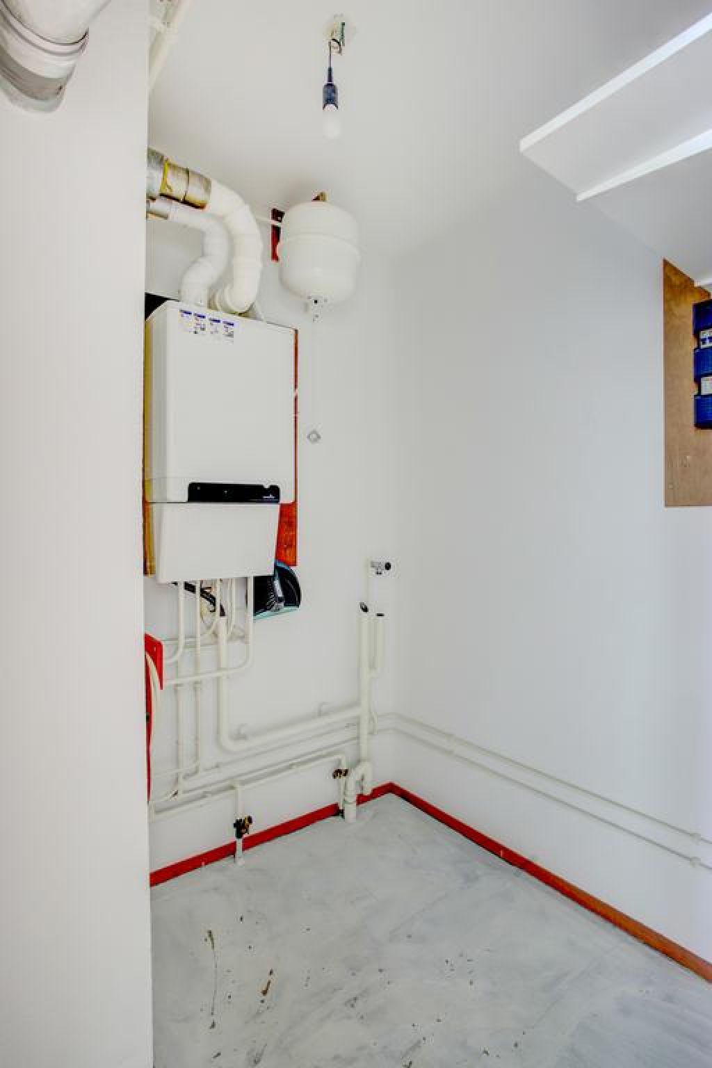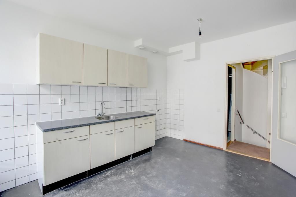 Eerste verdieping, hal, inpandige berging voorzien van een c.v.-ketel en een wasmachine aansluiting, keuken aan de achterzijde voorzien van een standaard keukenblok, trap naar de tweede verdieping.