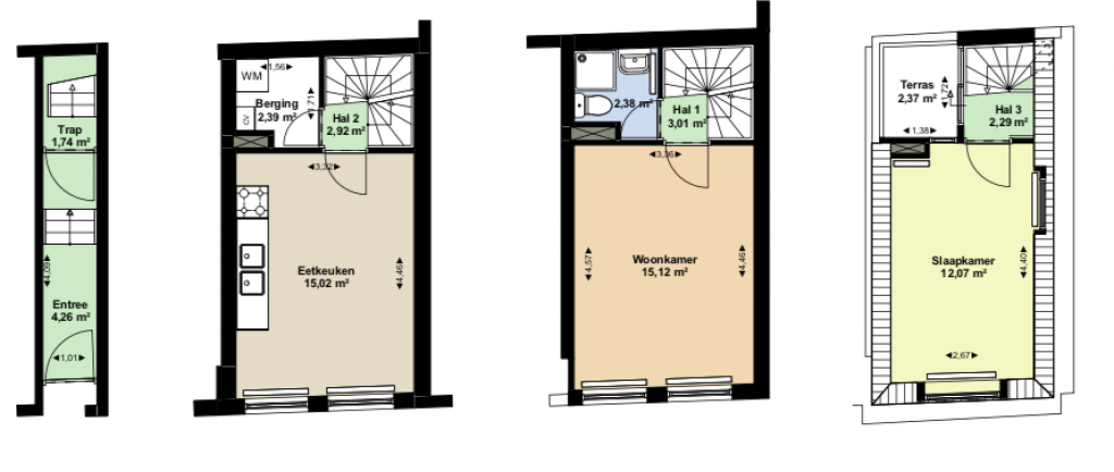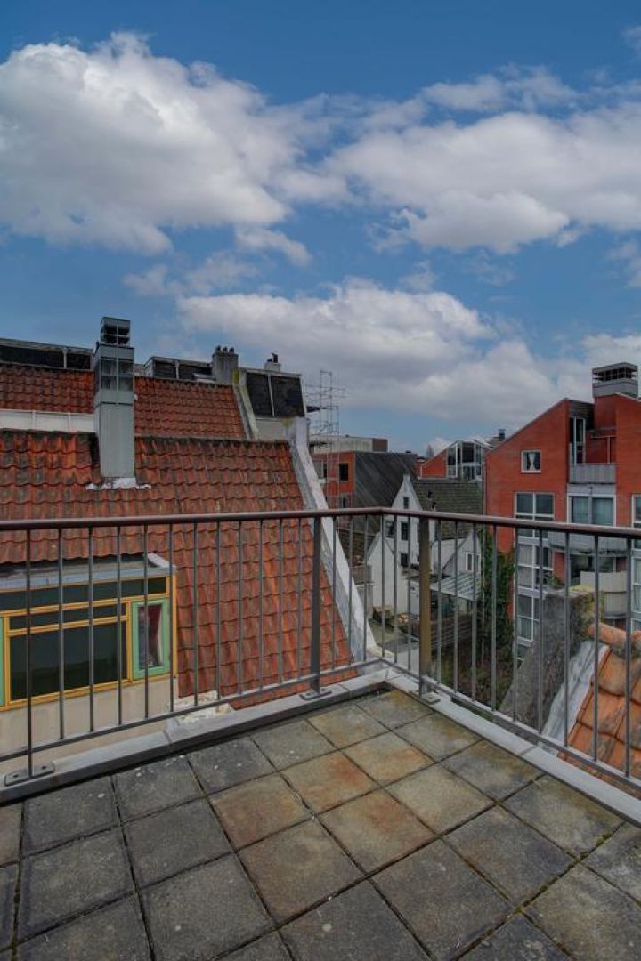 Derde verdieping, hal, slaapkamer aan de voorzijde, dakterras gelegen aan de achterzijde op het zuidwesten.