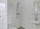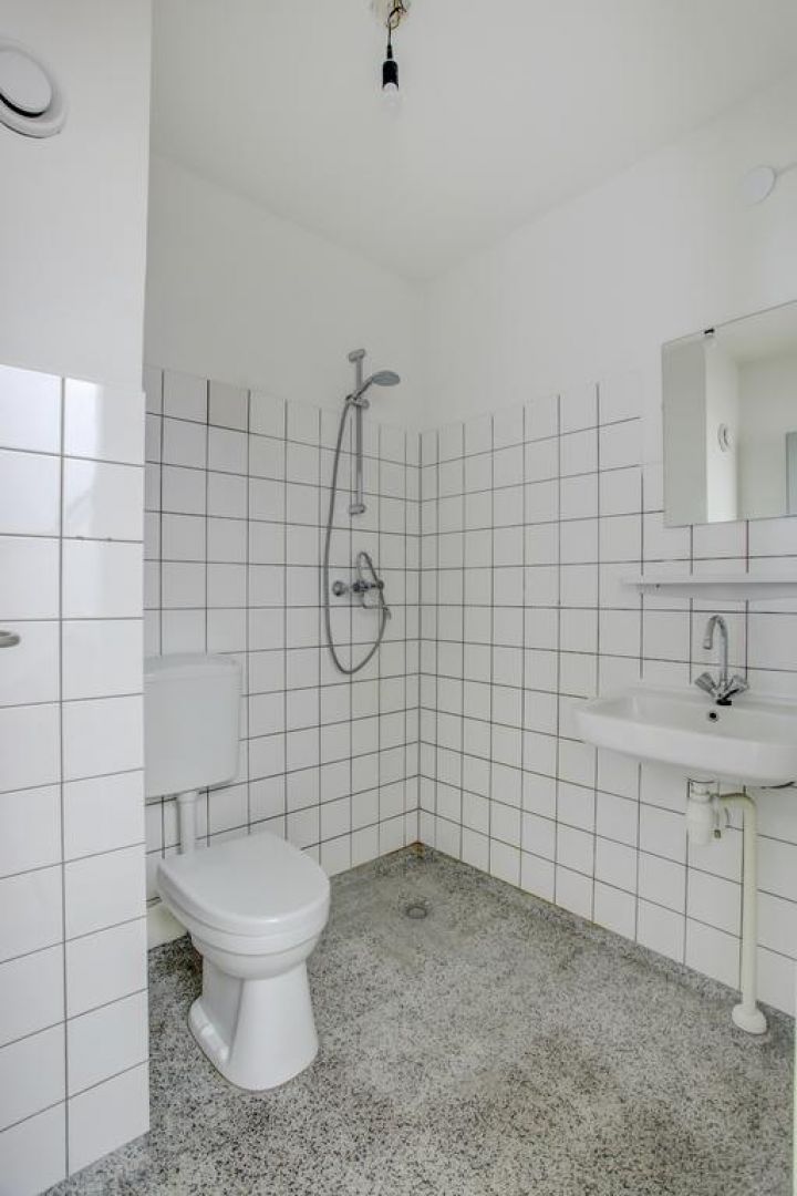 Tweede verdieping, overloop, badkamer voorzien van een douche, wastafel en een toilet, woonkamer aan de voorzijde, trap naar de derde verdieping.