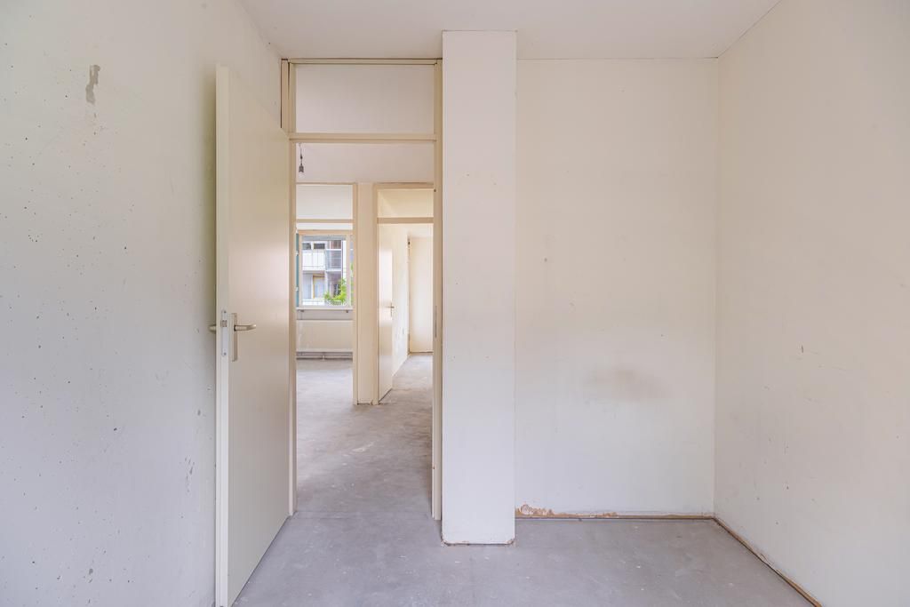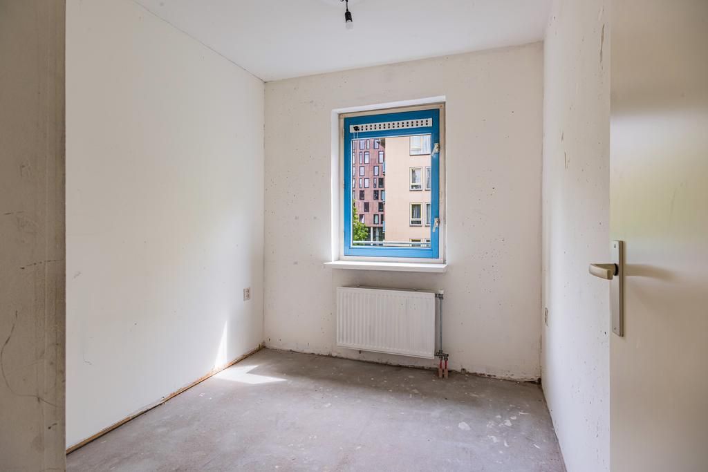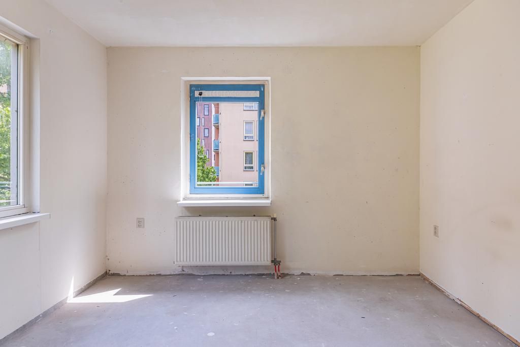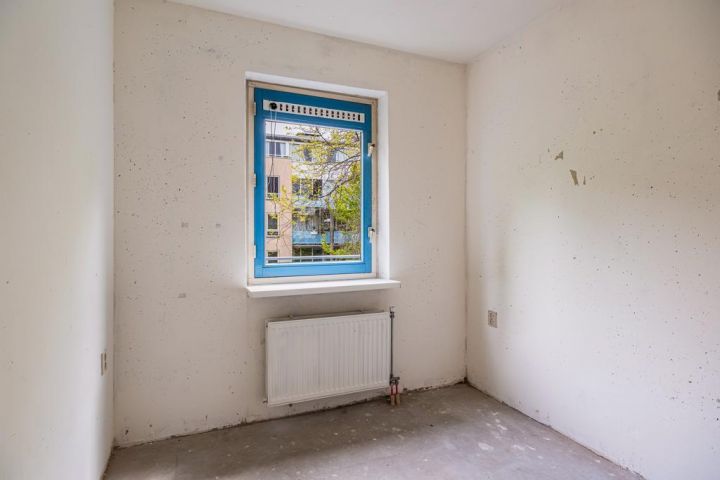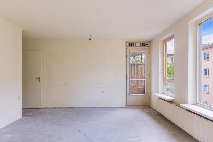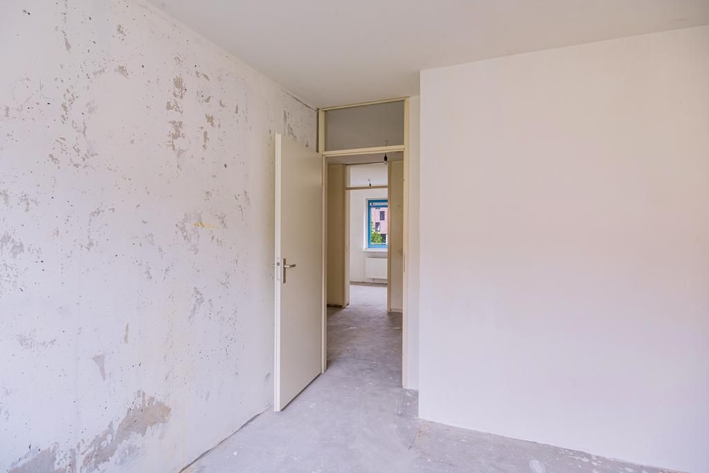 Tweede verdieping; hal, toilet met een fonteintje, badkamer (dient nog geplaatst te worden door de koper), 2 slaapkamers aan de achterzijde, keuken (dient nog geplaatst te worden door de koper) gelegen in het midden van de woning, woonkamer met toegang tot een balkon, balkon gelegen op het westen en de derde slaapkamer aan de voorzijde.