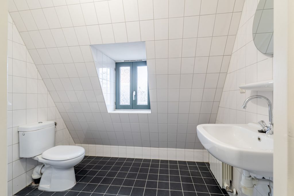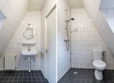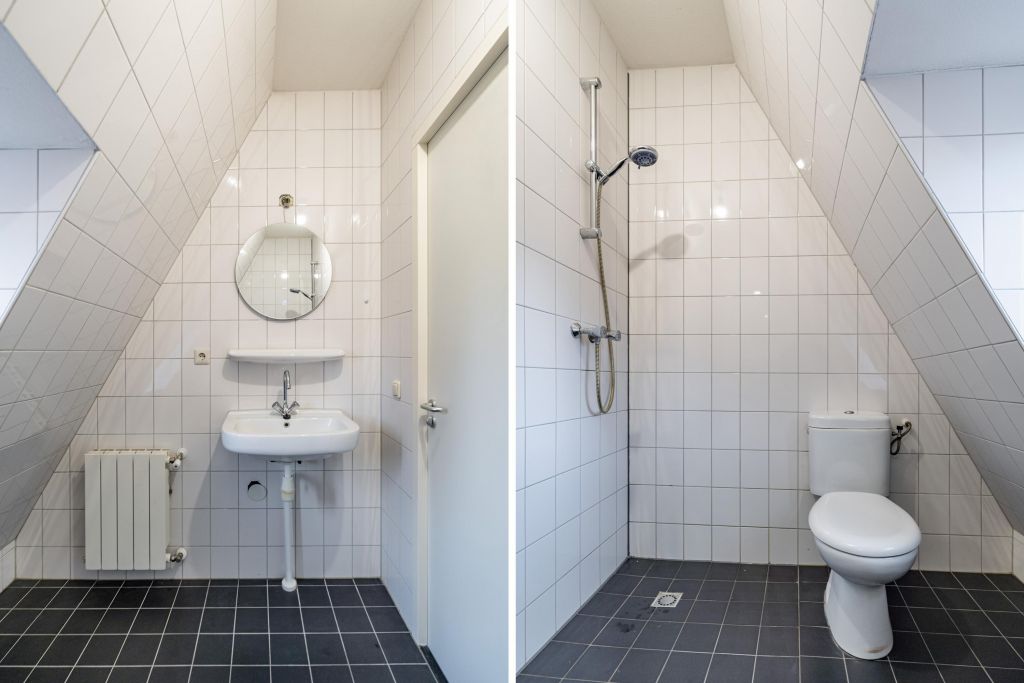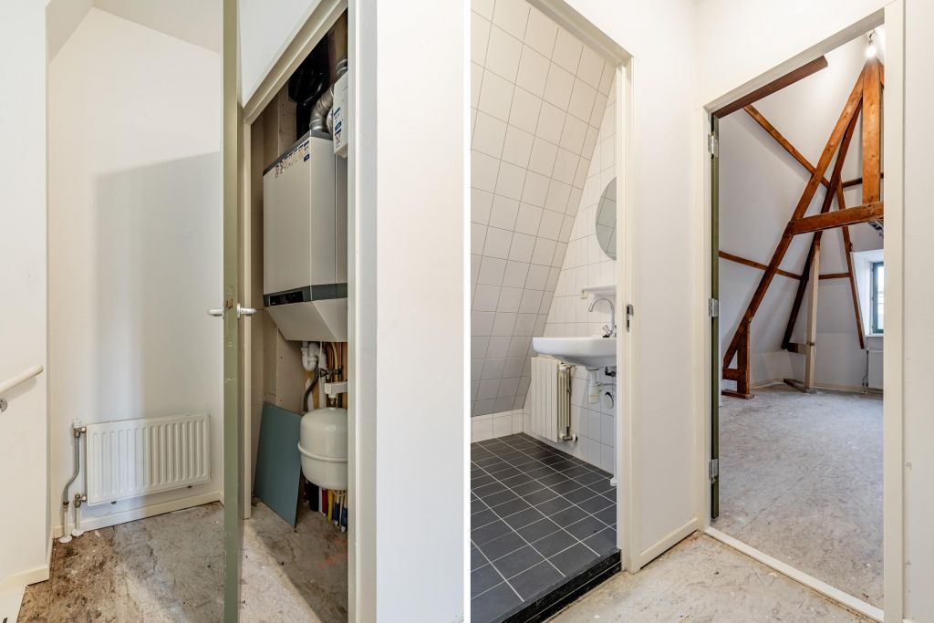 Overloop met Cv-kast, badkamer voorzien van tweede toilet, douche en wastafel. Ruime slaapkamer met hoge plafonds.