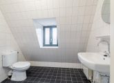 Separate toilet with a small sink and a convenient under-stairs cupboard with a washing machine connection. The living room features numerous windows and provides access to the open-plan kitchen. This simple design can be fully modernized to your own taste.