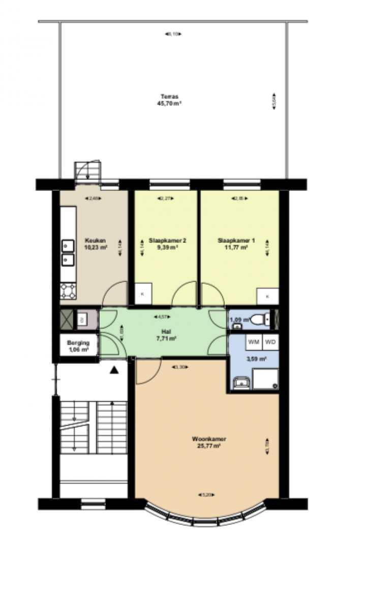 Heerlijk licht 3-kamer appartement van ca. 75 m2 gelegen op de 1e verdieping met een dakterras van ca. 25 m2 en een berging in de onderbouw!