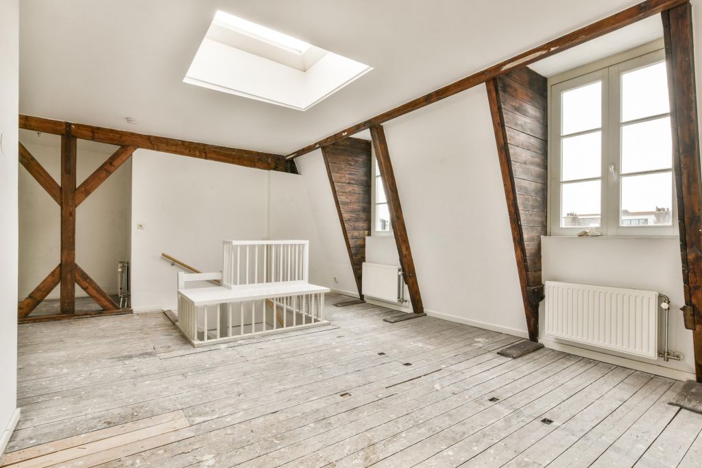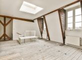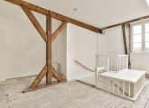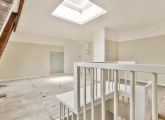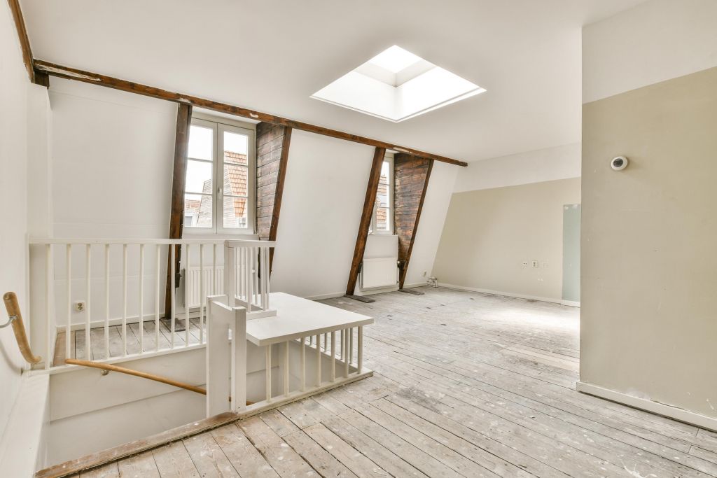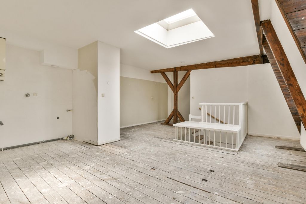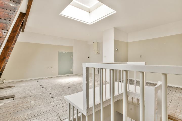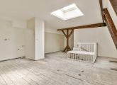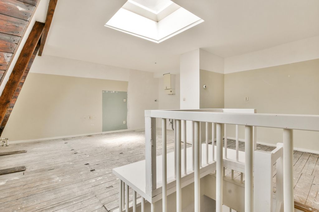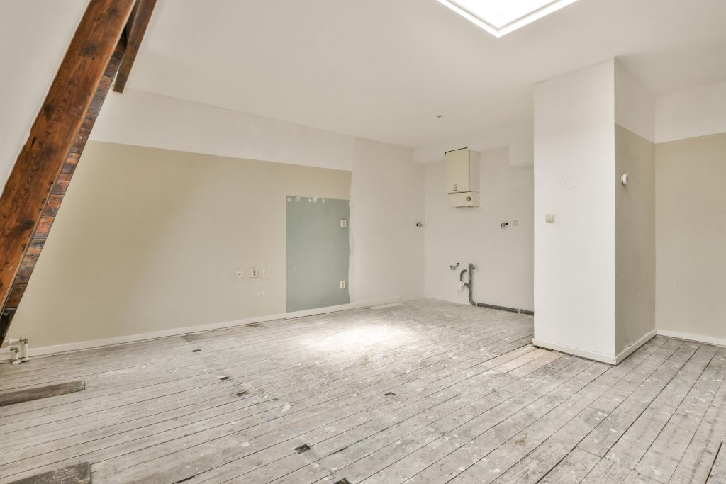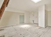Vierde verdieping; de woonkamer met een open keuken (dient nog geplaatst te worden door de koper).