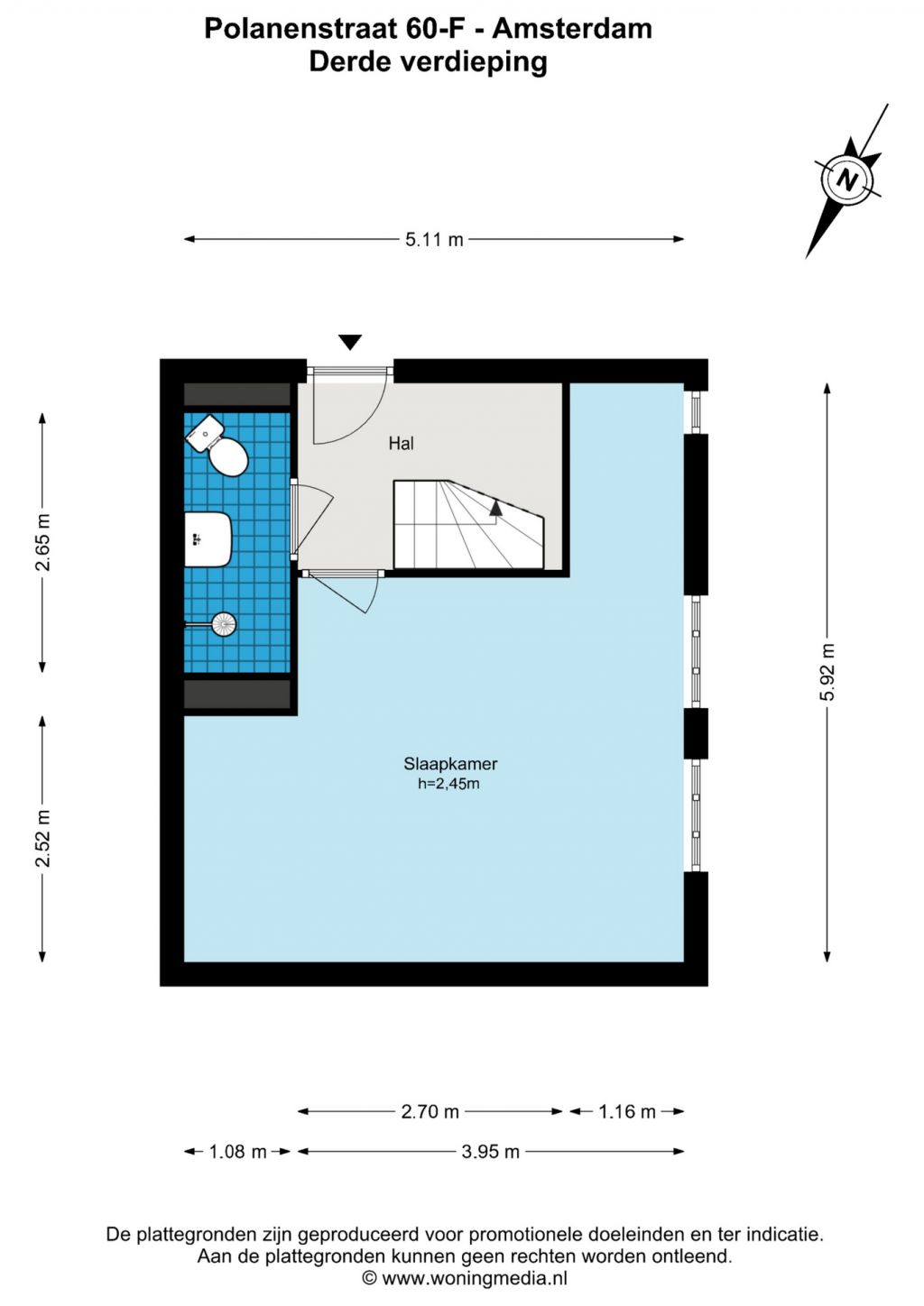 Via het gemeenschappelijk trappenhuis naar de derde verdieping; hal, royale slaapkamer, de badkamer voorzien van een toilet, een douche en een wastafel, interne trap naar de vierde verdieping.