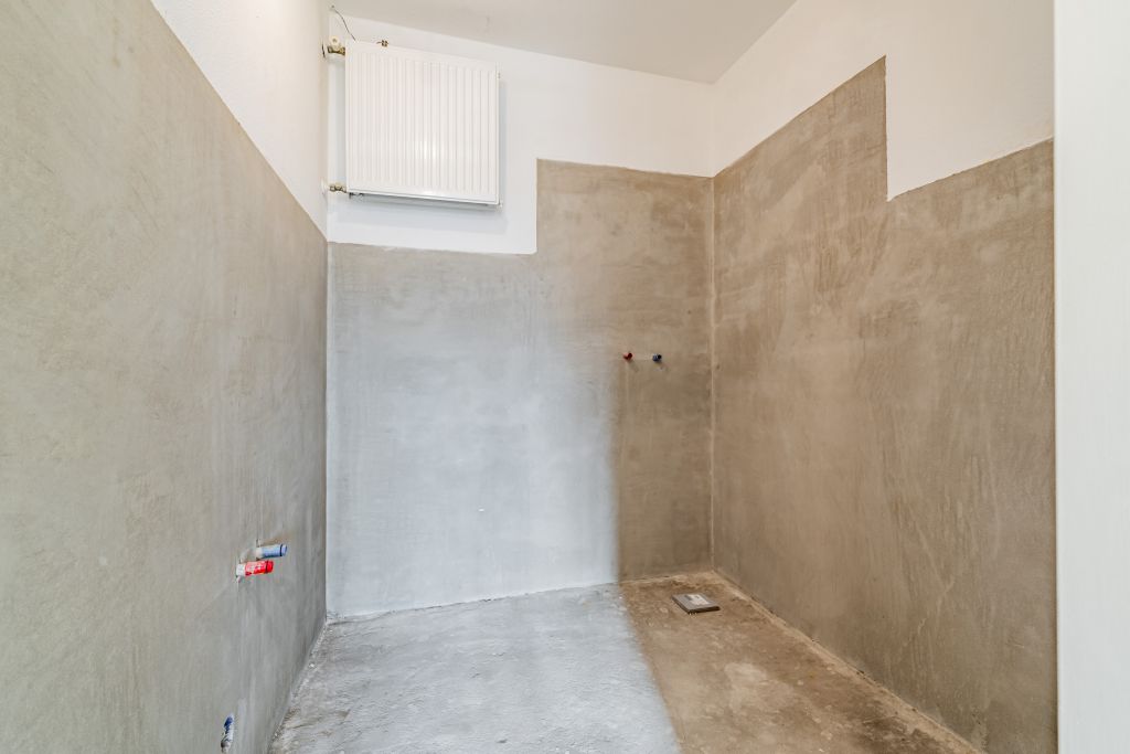 Entrance hall with meter cupboard, separate toilet, and boiler room. Bathroom can be decorated to your own taste. The living room and bedroom are located at the rear of the house and both have access to the south-facing balcony. The kitchen is located at the front and is fully equipped, allowing you to create the kitchen of your dreams.