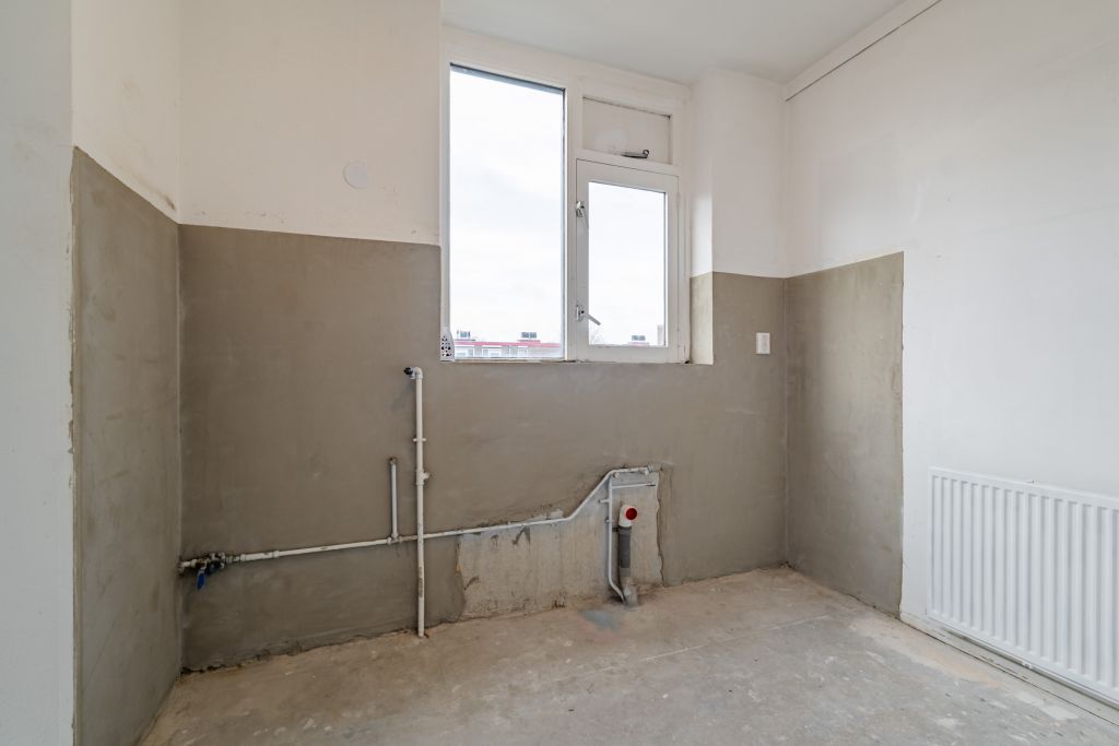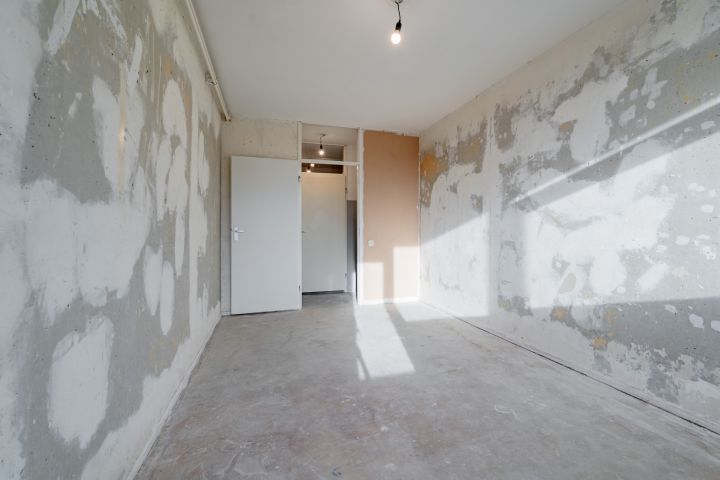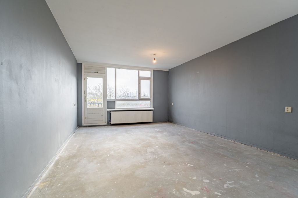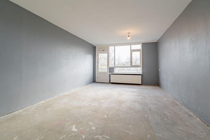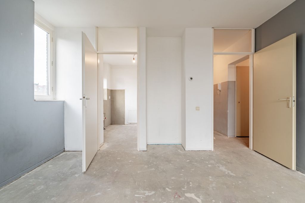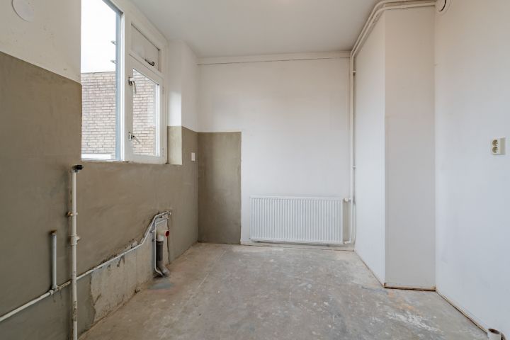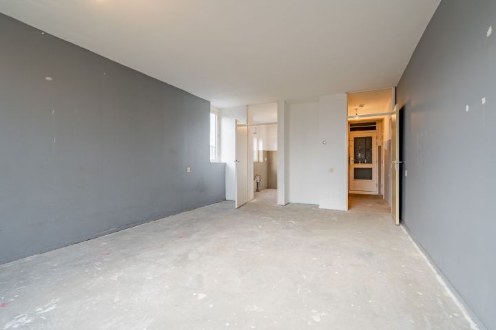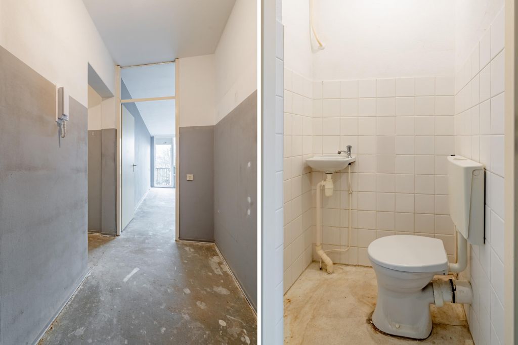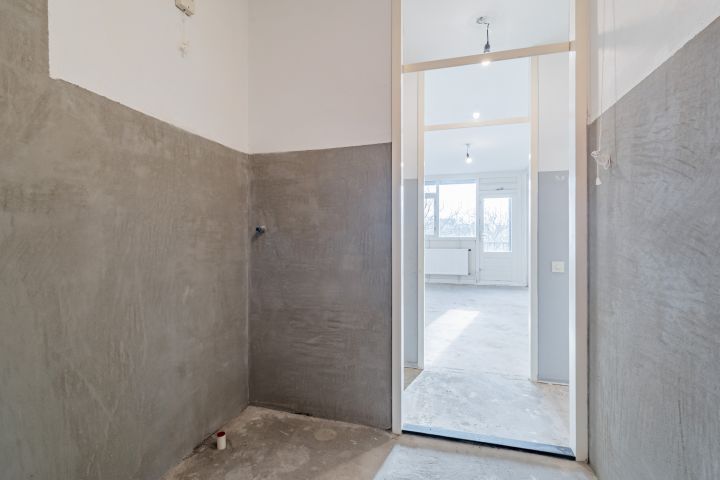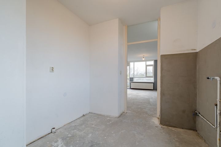 Entree woning, hal met meterkast, separaat toilet en cv-ruimte. Badkamer welke nog naar eigen smaak ingericht kan worden. De woonkamer en slaapkamer zijn gelegen aan de achterzijde en hebben beide toegang tot het balkon gelegen op het zuiden. De keuken bevindt zich aan de voorzijde en is voorzien van alle aansluitingen, hier kun je de keuken van je dromen realiseren.