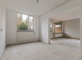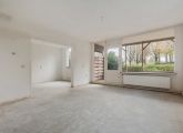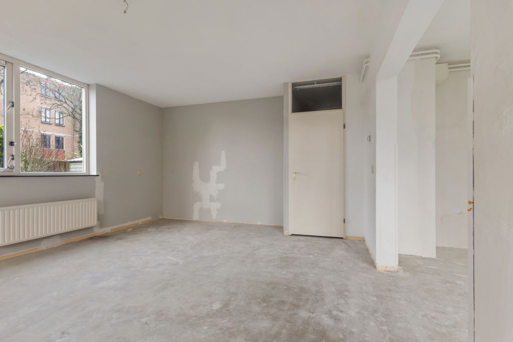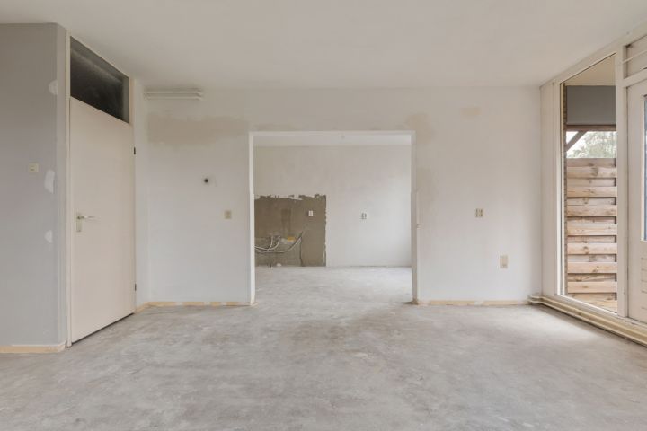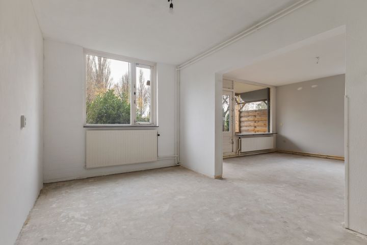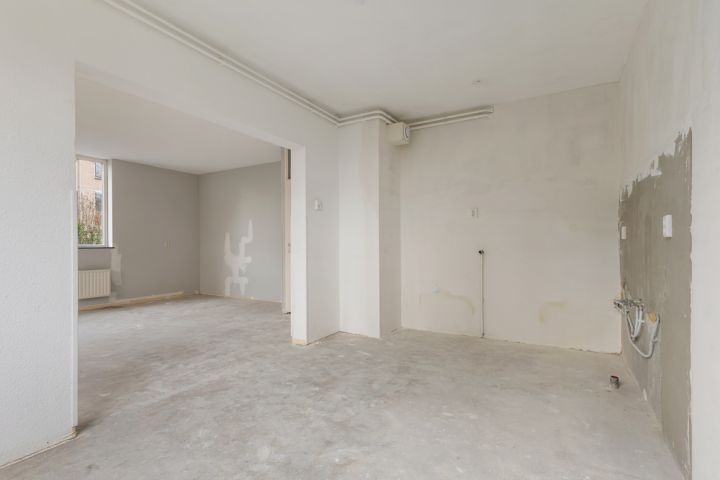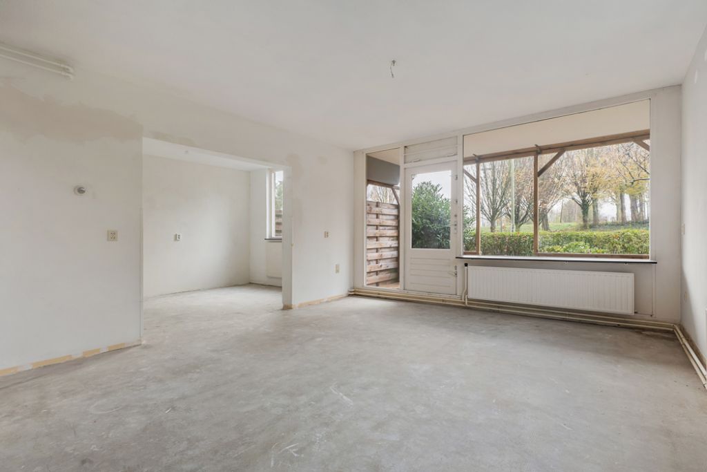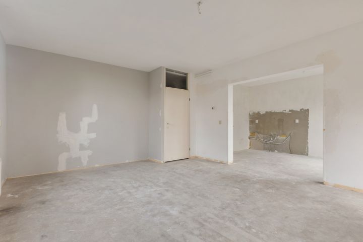 Aan de linkerkant van de hal ligt de royale woonkamer, voorzien van grote raampartijen die samen met de hoekligging zorgen voor een overvloed aan natuurlijk licht. De halfopen keuken is ruim en biedt volop mogelijkheden om een persoonlijk kookparadijs te creëren. Hier kun je helemaal je eigen stijl en inrichting tot leven brengen.