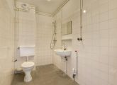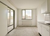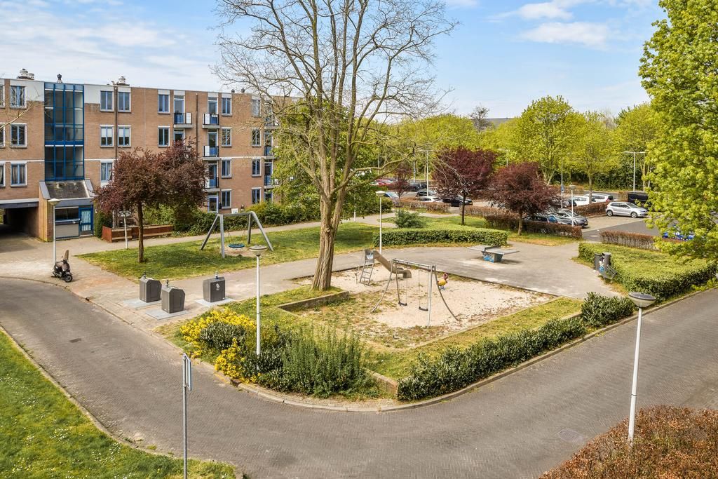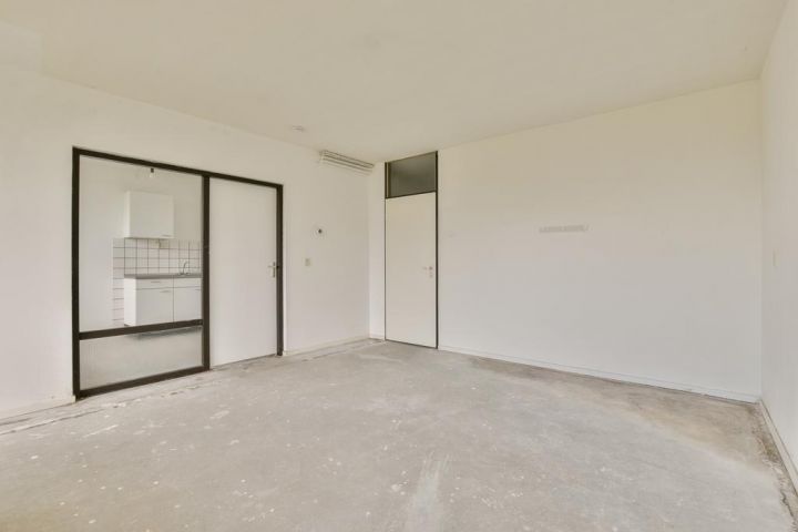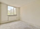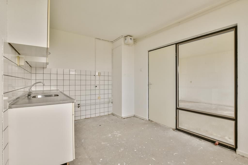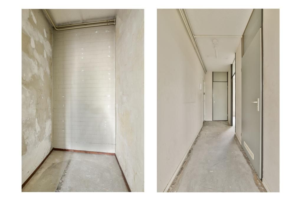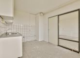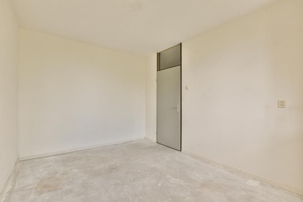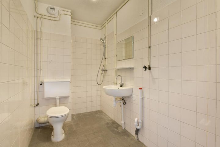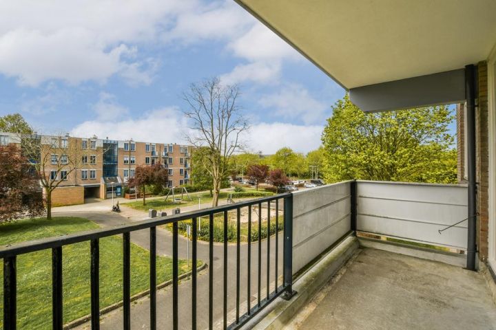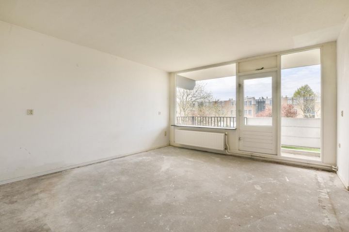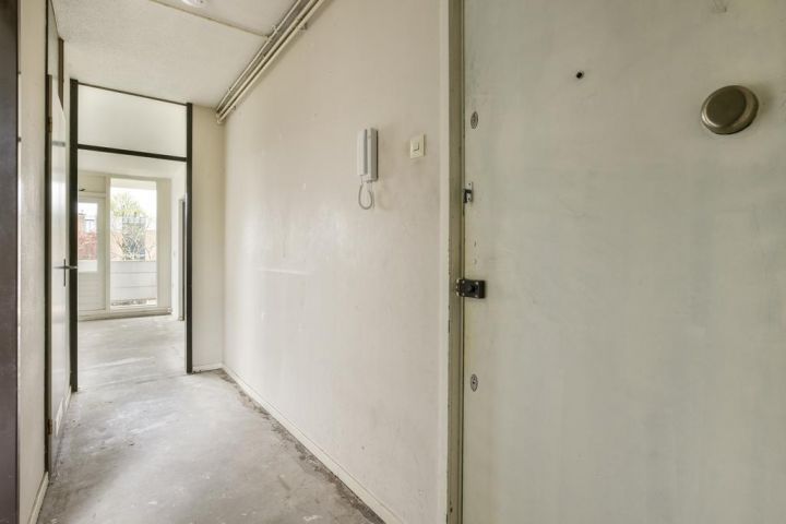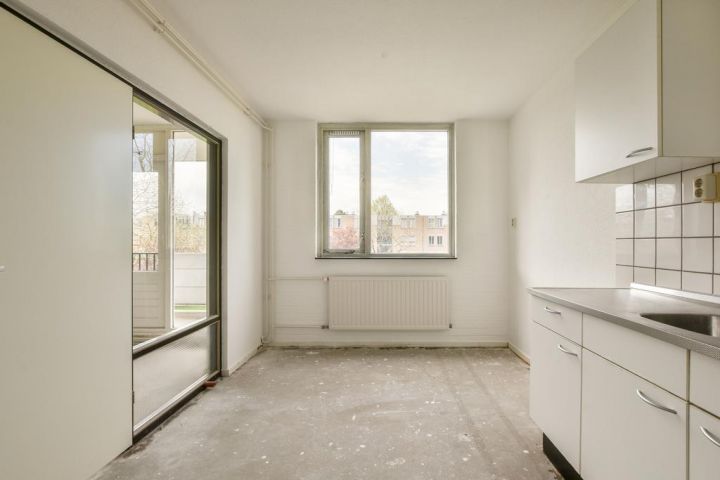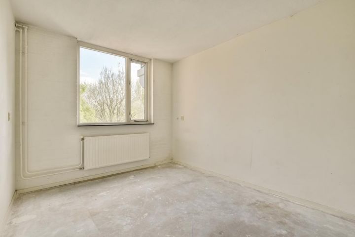Via het trappenhuis bereik je de tweede verdieping. De hal geeft toegang tot vrijwel alle vertrekken. De woonkamer aan de voorzijde ontvangt veel natuurlijk licht dankzij grote ramen en biedt toegang tot het balkon op het westen, met uitzicht op een gezellig plantsoentje en een speeltuin. Aangrenzend bevindt zich de ruime keuken, momenteel voorzien van een eenvoudig keukenblok. Aan de achterzijde ligt de slaapkamer met uitzicht op het groen. Naast de slaapkamer is een handige bergkast, die eventueel bij de slaapkamer kan worden betrokken. Centraal in de woning bevindt zich de badkamer, uitgerust met een toilet, douche, wastafel en aansluiting voor wasmachine en/of droger.