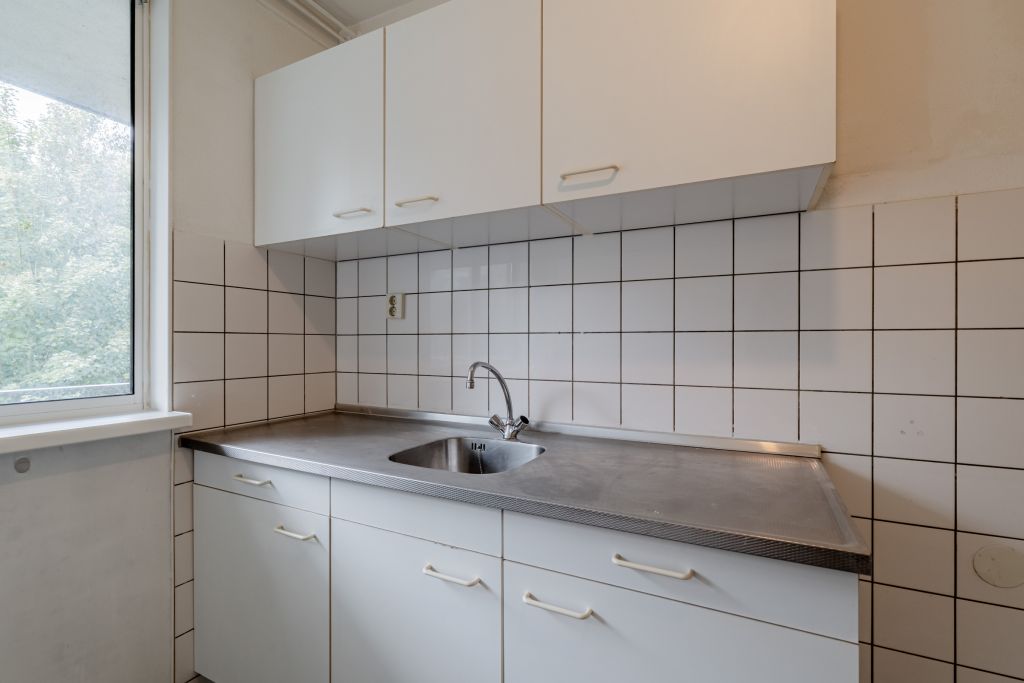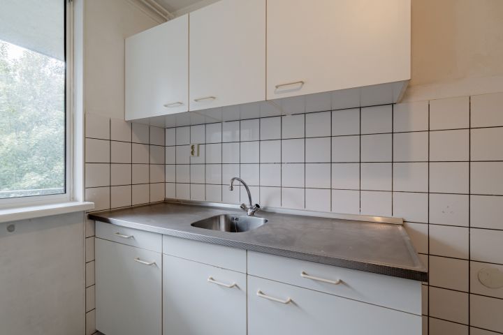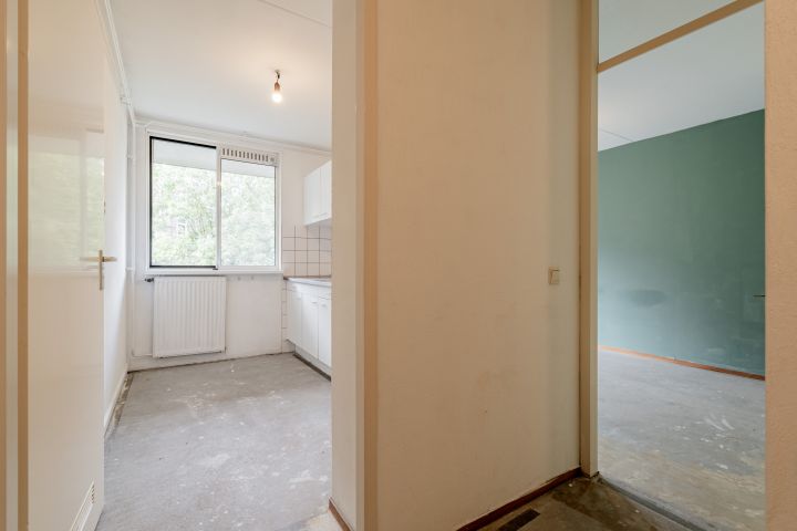 De keuken aan de achterzijde is eenvoudig van opzet en kan volledig naar eigen wens worden gemoderniseerd.