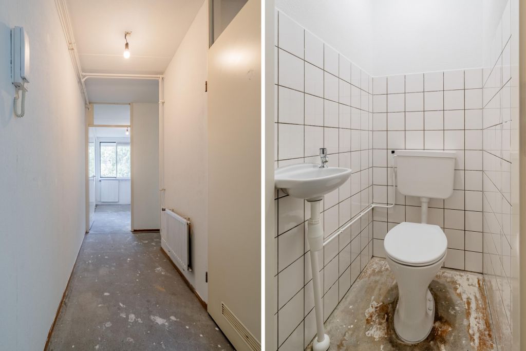 De hal vormt hier het centrale punt en geeft toegang tot het separate toilet met fonteintje, een handige bergkast, de woonkamer, een slaapkamer en de keuken.