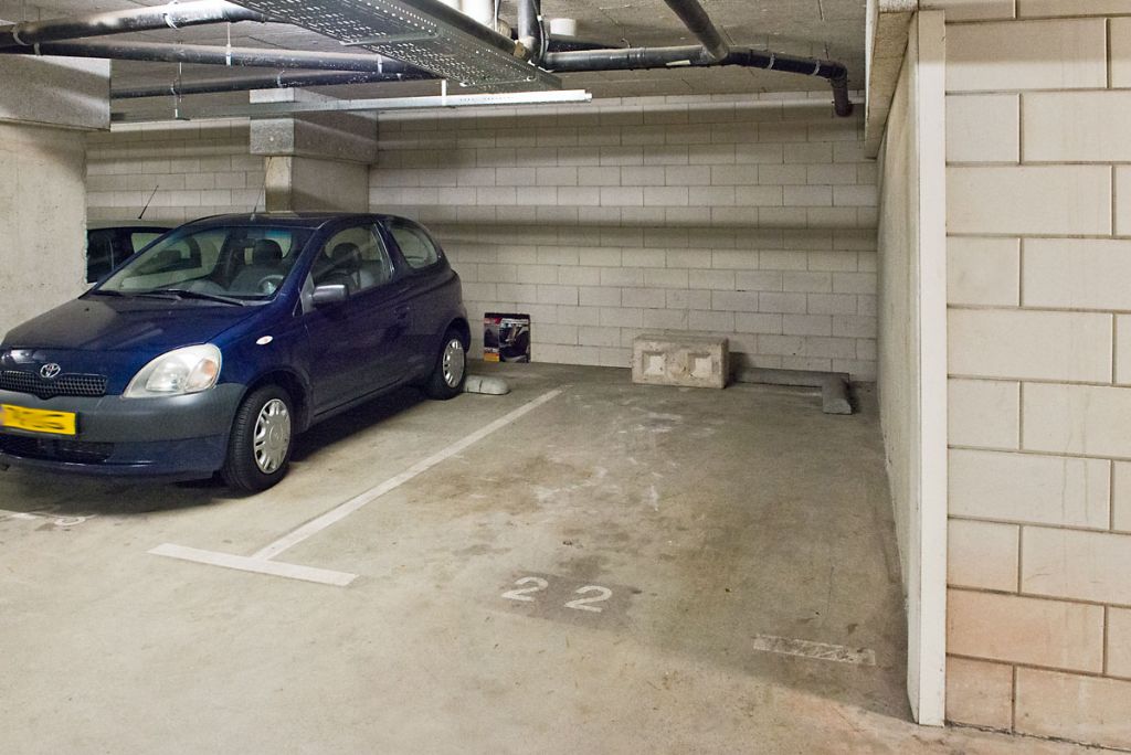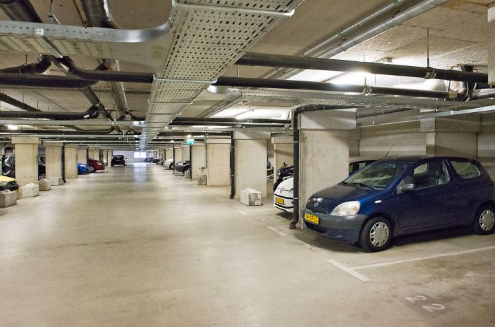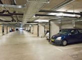 Dit is een overdekte parkeergarage, waarbij de toegang wordt verleend met een zender