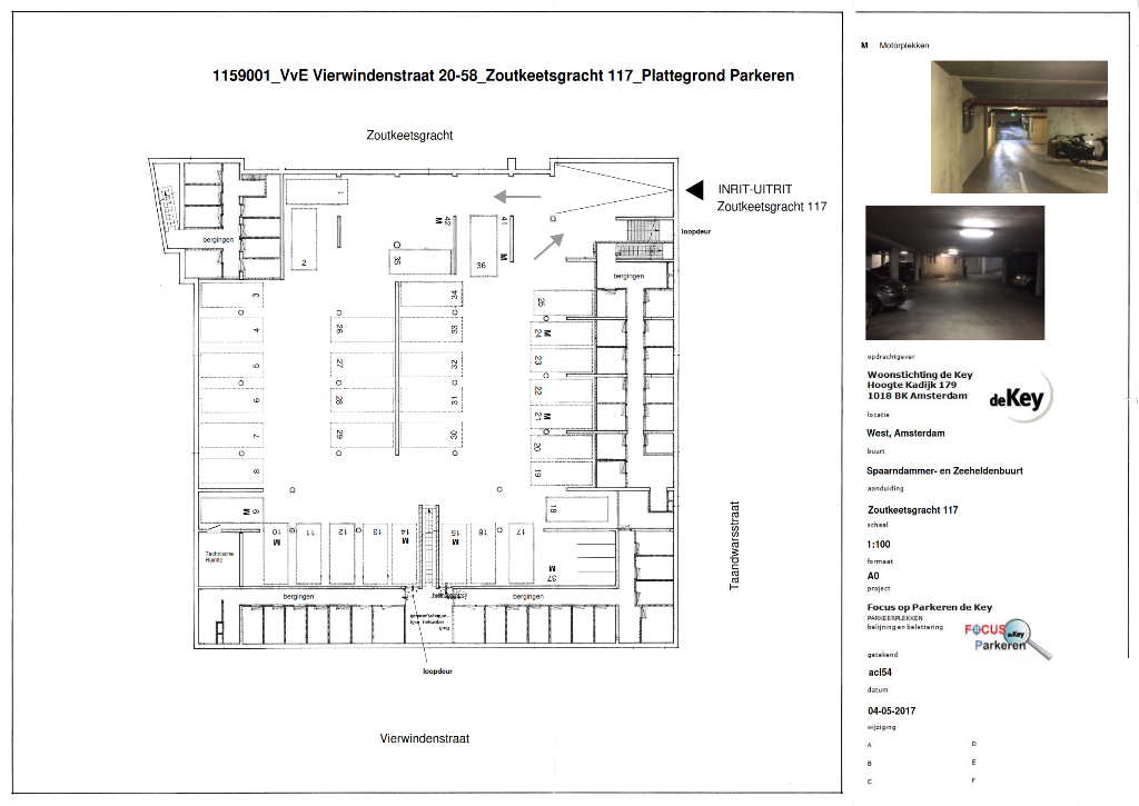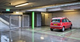 Overdekte garage in centrum van Amsterdam. Relatief smalle parkeerplekken niet geschikt voor busjes en hele grote auto's.